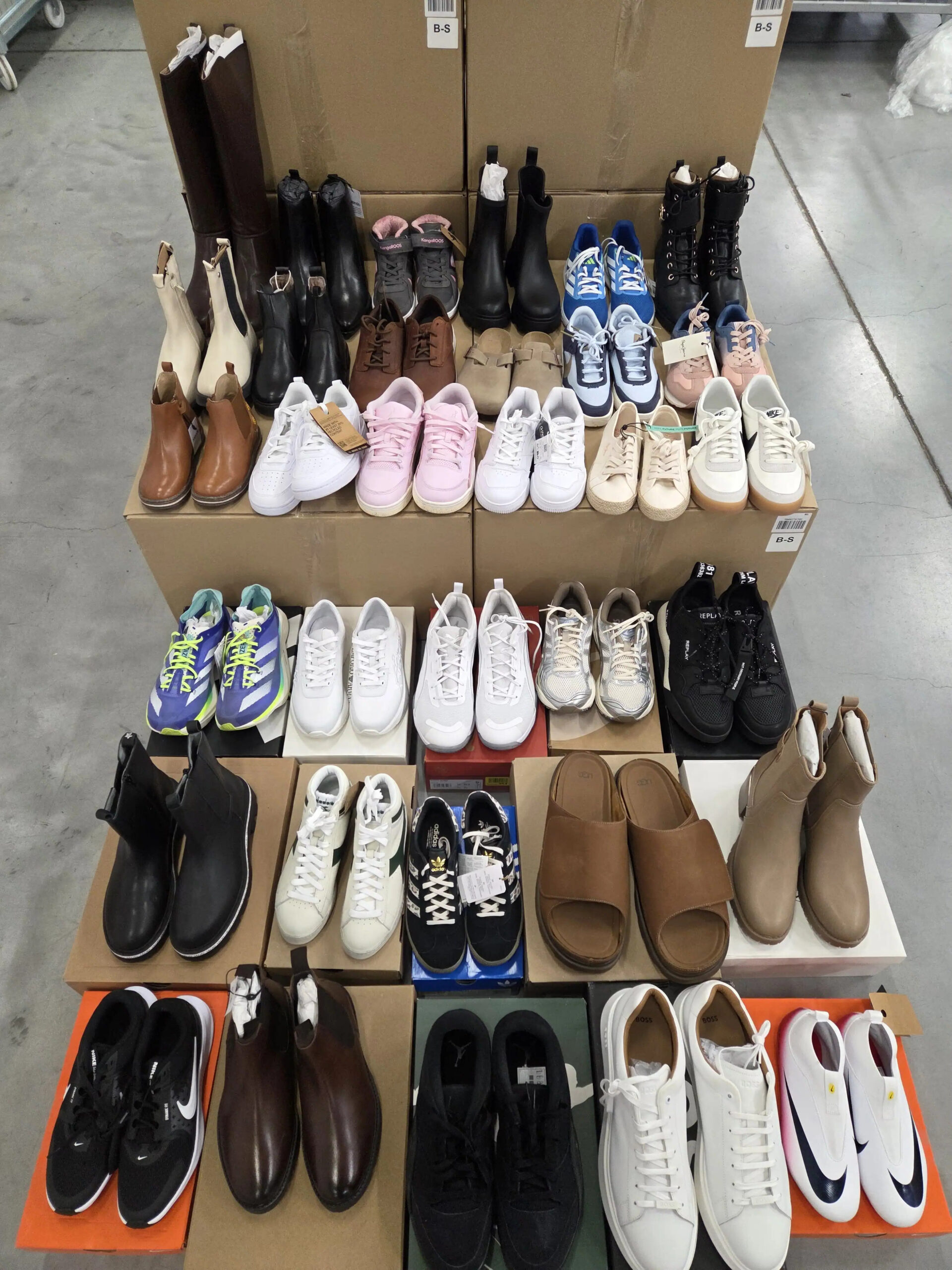 Zdjęcie ukazuje przykładową zawartość palet Paleta zawiera obuwie pochodzące bezpośrednio z jednej z największych rozpoznawalnych platform eCommerce w Europie. Obuwie w kategorii B to zwroty konsumenckie w obuwia kartonikach.
