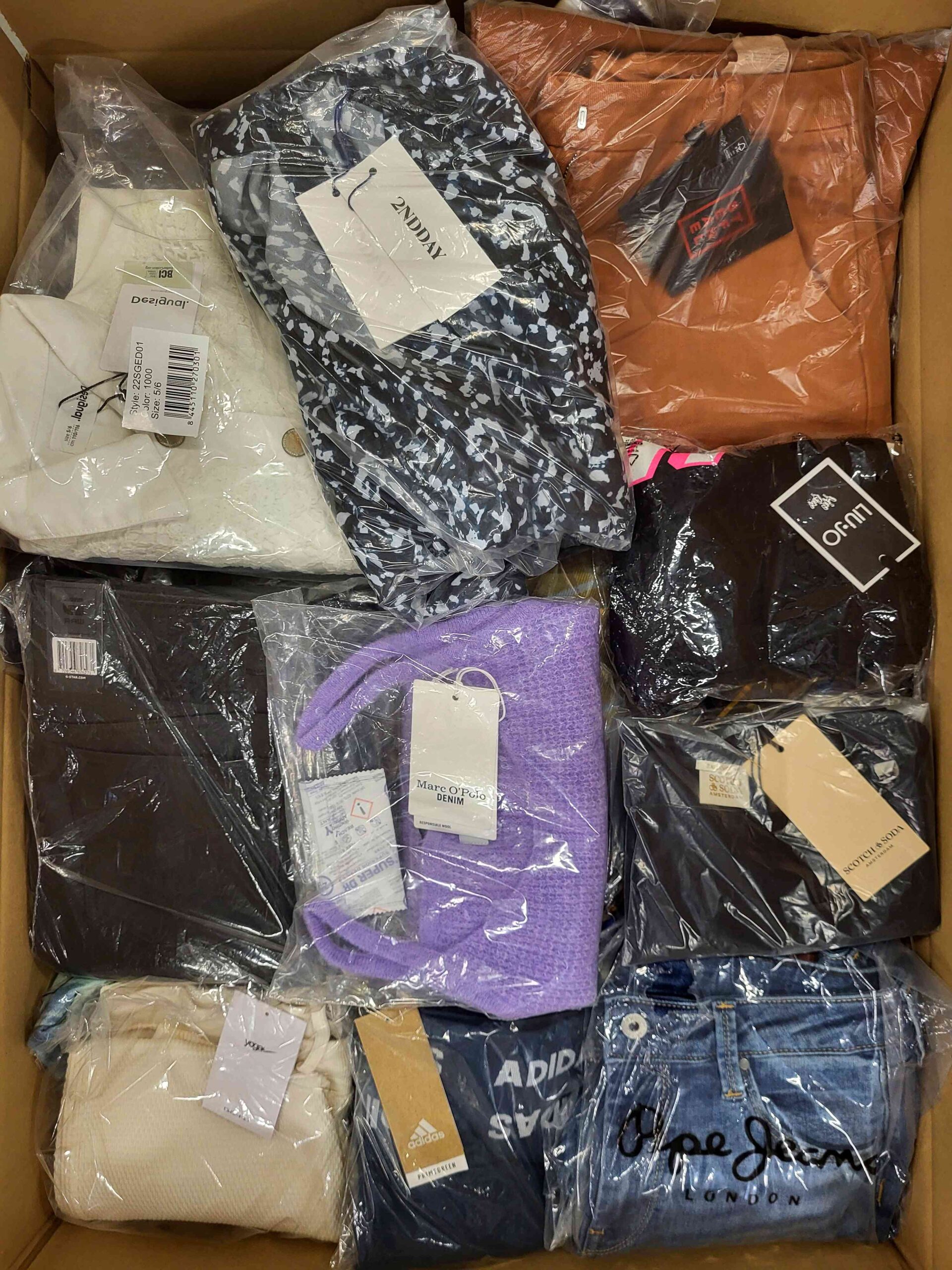 Pakiet odzieży zawierający mix marek w kategorii jakościowej A. Ok. 100% pakietu z metką papierową, a 20-25% to najbardziej rozpoznawalne marki. Pokazana wierzchnia warstwa jest zawartością tego pakietu oraz przedstawia najlepsze marki.