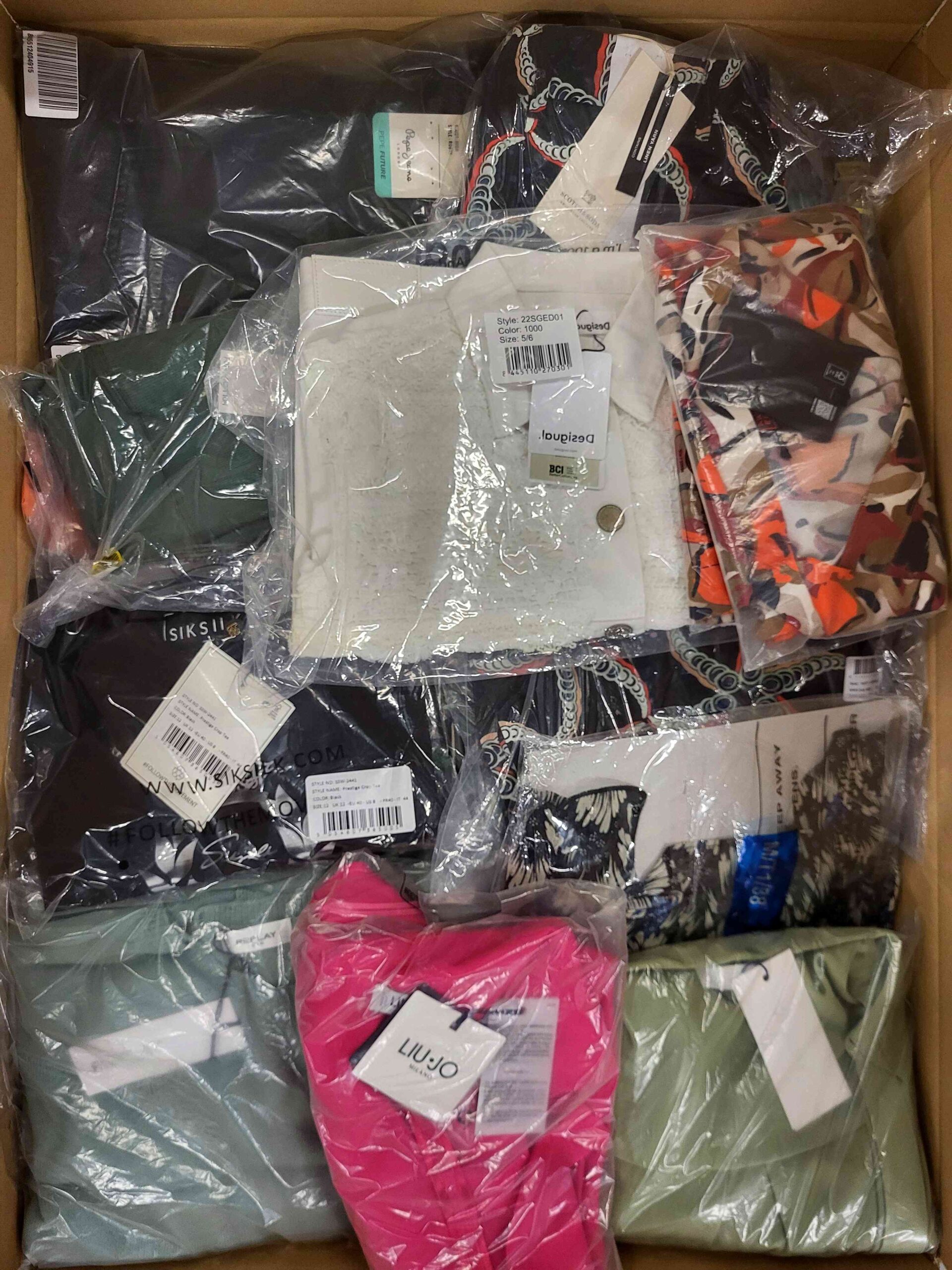 Pakiet odzieży zawierający mix marek w kategorii jakościowej A. Ok. 100% pakietu z metką papierową, a 20-25% to najbardziej rozpoznawalne marki. Pokazana wierzchnia warstwa jest zawartością tego pakietu oraz przedstawia najlepsze marki.