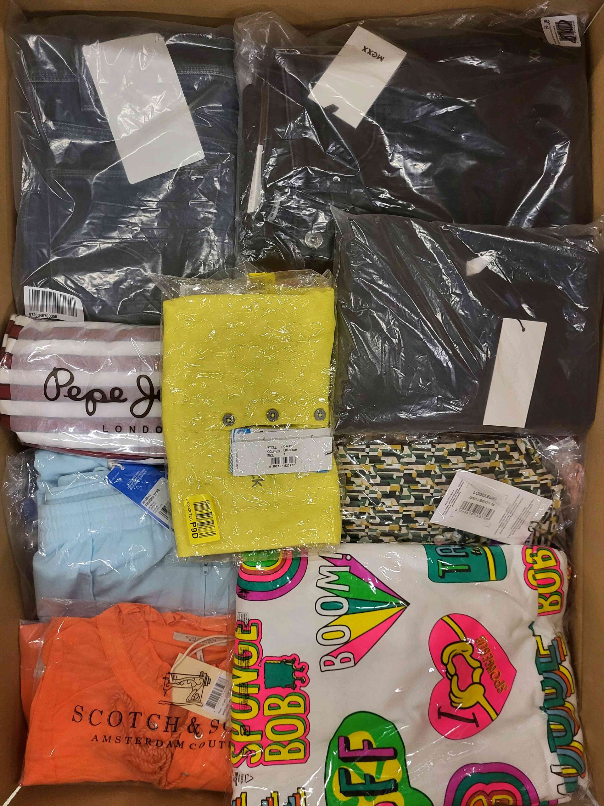 Pakiet odzieży zawierający mix marek w kategorii jakościowej A. Ok. 100% pakietu z metką papierową, a 20-25% to najbardziej rozpoznawalne marki. Pokazana wierzchnia warstwa jest zawartością tego pakietu oraz przedstawia najlepsze marki.