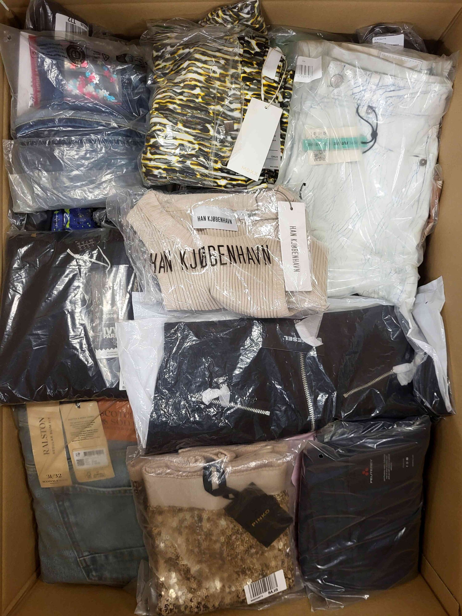 Pakiet odzieży zawierający mix marek w kategorii jakościowej A. Ok. 100% pakietu z metką papierową, a 20-25% to najbardziej rozpoznawalne marki. Pokazana wierzchnia warstwa jest zawartością tego pakietu oraz przedstawia najlepsze marki.