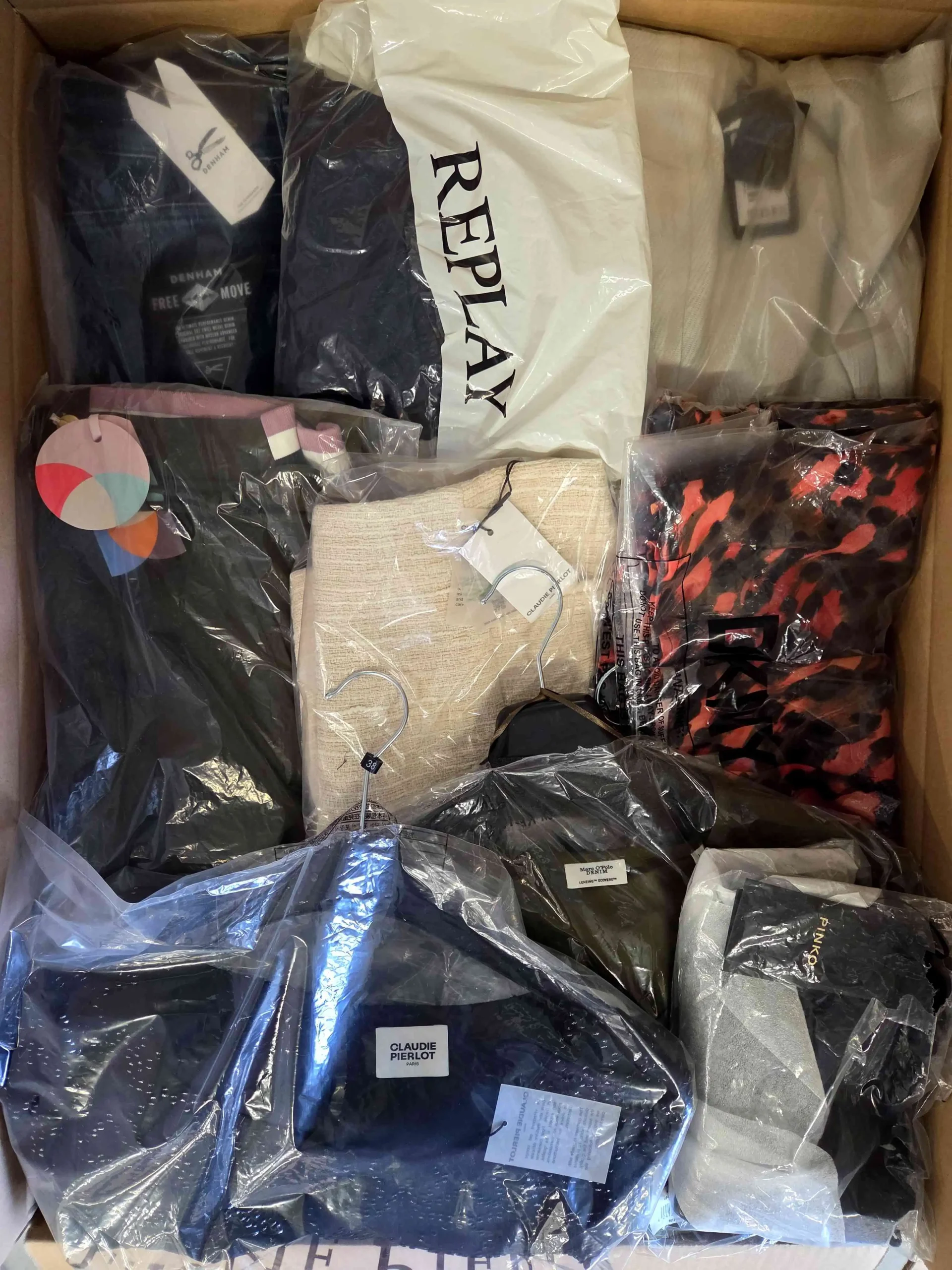 Pakiet odzieży zawierający mix marek w kategorii jakościowej A. Ok. 100% pakietu z metką papierową, a 30-35% to najbardziej rozpoznawalne marki. Pokazana wierzchnia warstwa jest zawartością tego pakietu oraz przedstawia najlepsze marki.