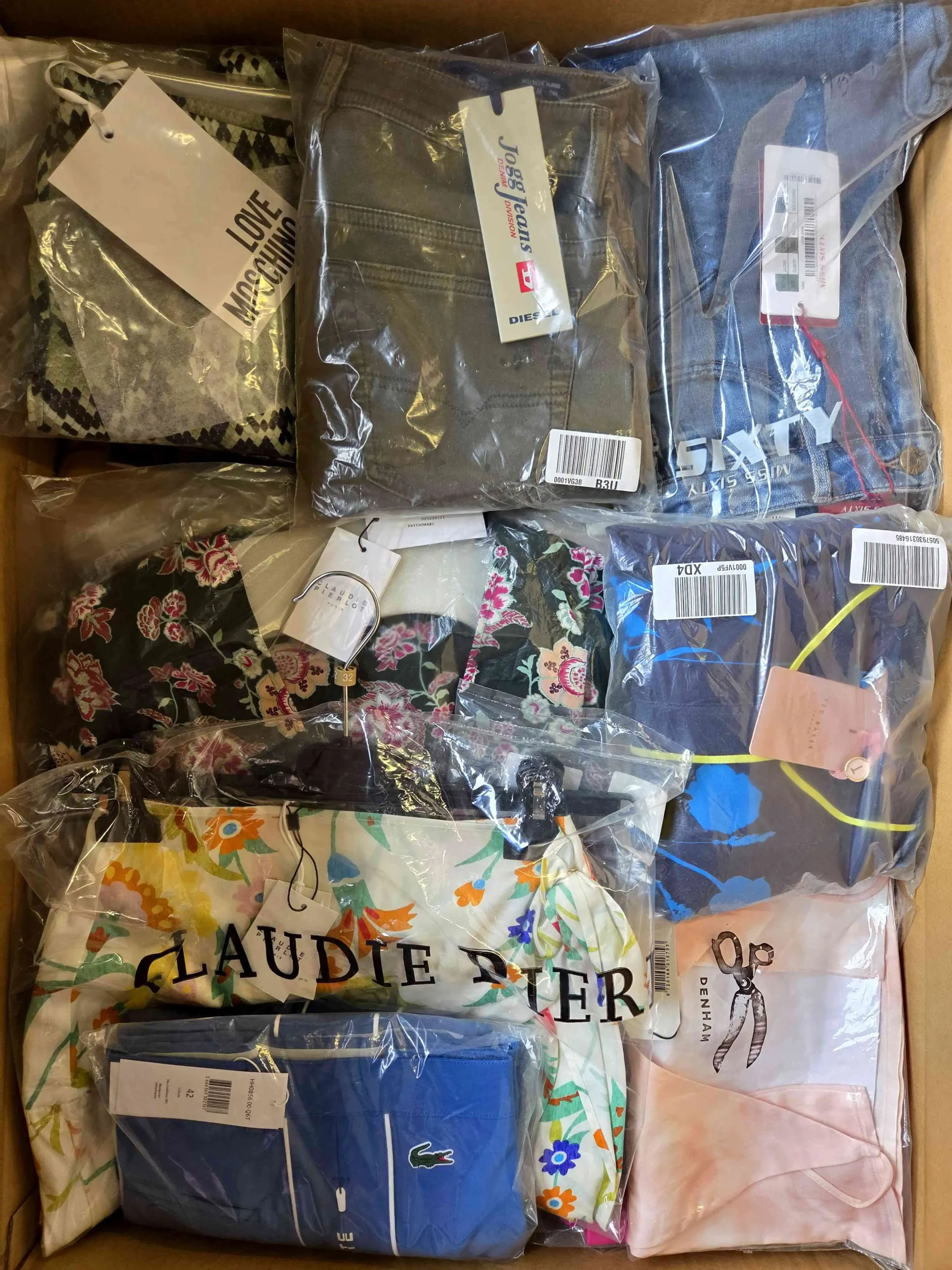 Pakiet odzieży zawierający mix marek w kategorii jakościowej A. Ok. 100% pakietu z metką papierową, a 30-35% to najbardziej rozpoznawalne marki. Pokazana wierzchnia warstwa jest zawartością tego pakietu oraz przedstawia najlepsze marki.