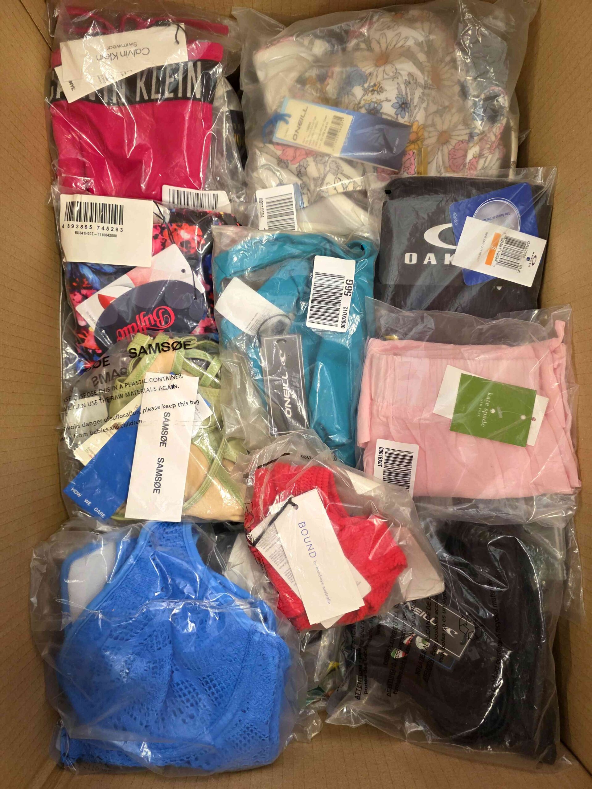 W skład pakietu wchodzą między innymi: staniki, majtki(około 40 sztuk), strój kąpielowy jednoczęściowy, spodenki, bluzki. W pakiecie znajduje się 70 sztuk. Pakiety w kategorii A zawierają produkty z poprzednich kolekcji i sezonów.