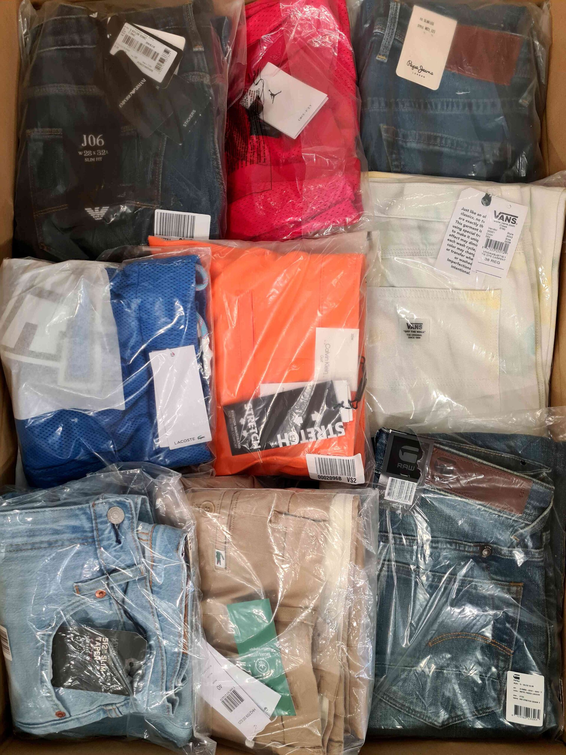 Pakiet odzieży męskiej zawierający mix marek w kategorii jakościowej A. Ok. 100% pakietu z metką papierową, a około 40% to najbardziej rozpoznawalne marki. Pokazana wierzchnia warstwa jest zawartością tego pakietu oraz przedstawia najlepsze marki.