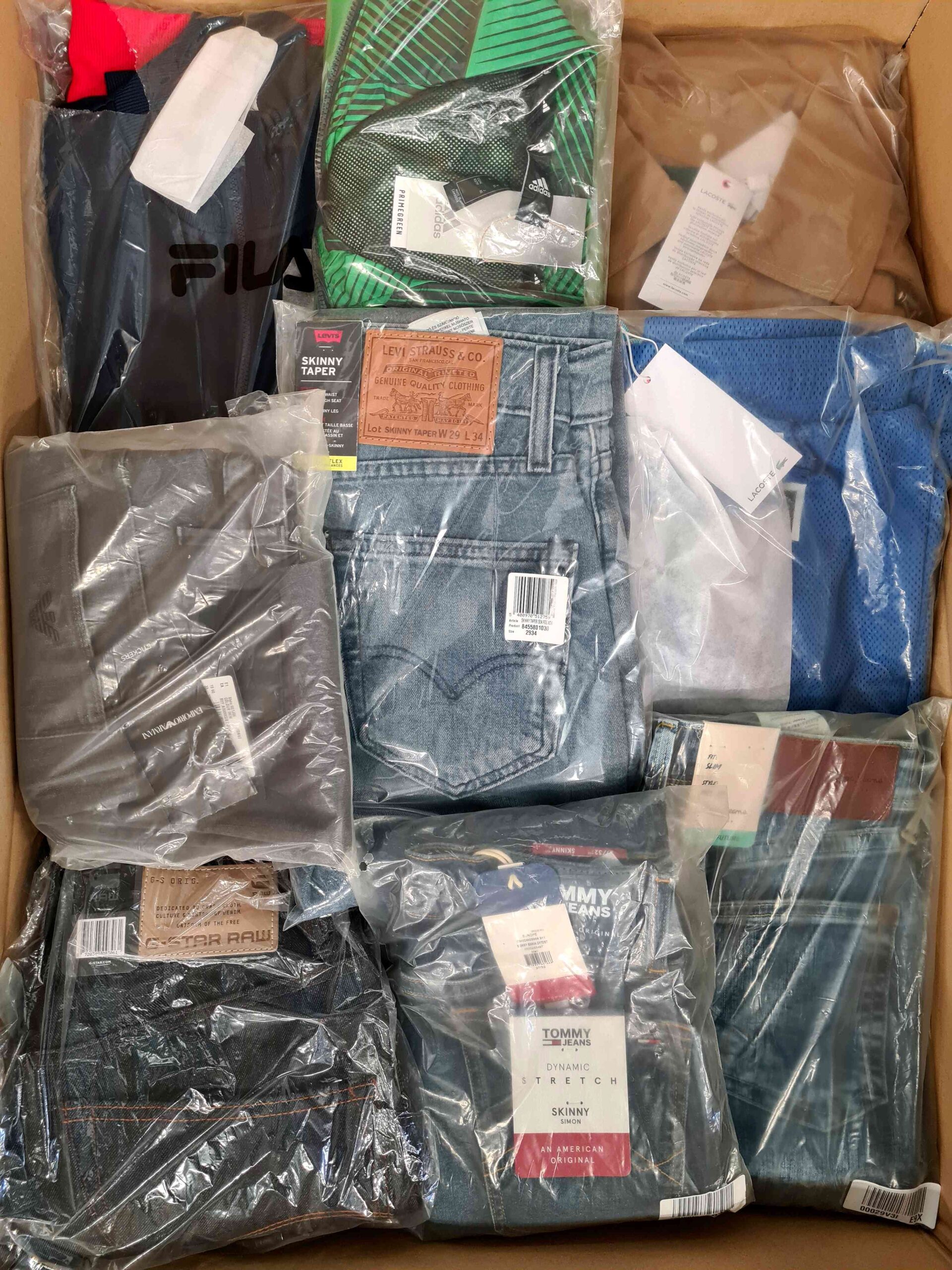 Pakiet odzieży męskiej zawierający mix marek w kategorii jakościowej A. Ok. 100% pakietu z metką papierową, a około 40% to najbardziej rozpoznawalne marki. Pokazana wierzchnia warstwa jest zawartością tego pakietu oraz przedstawia najlepsze marki.