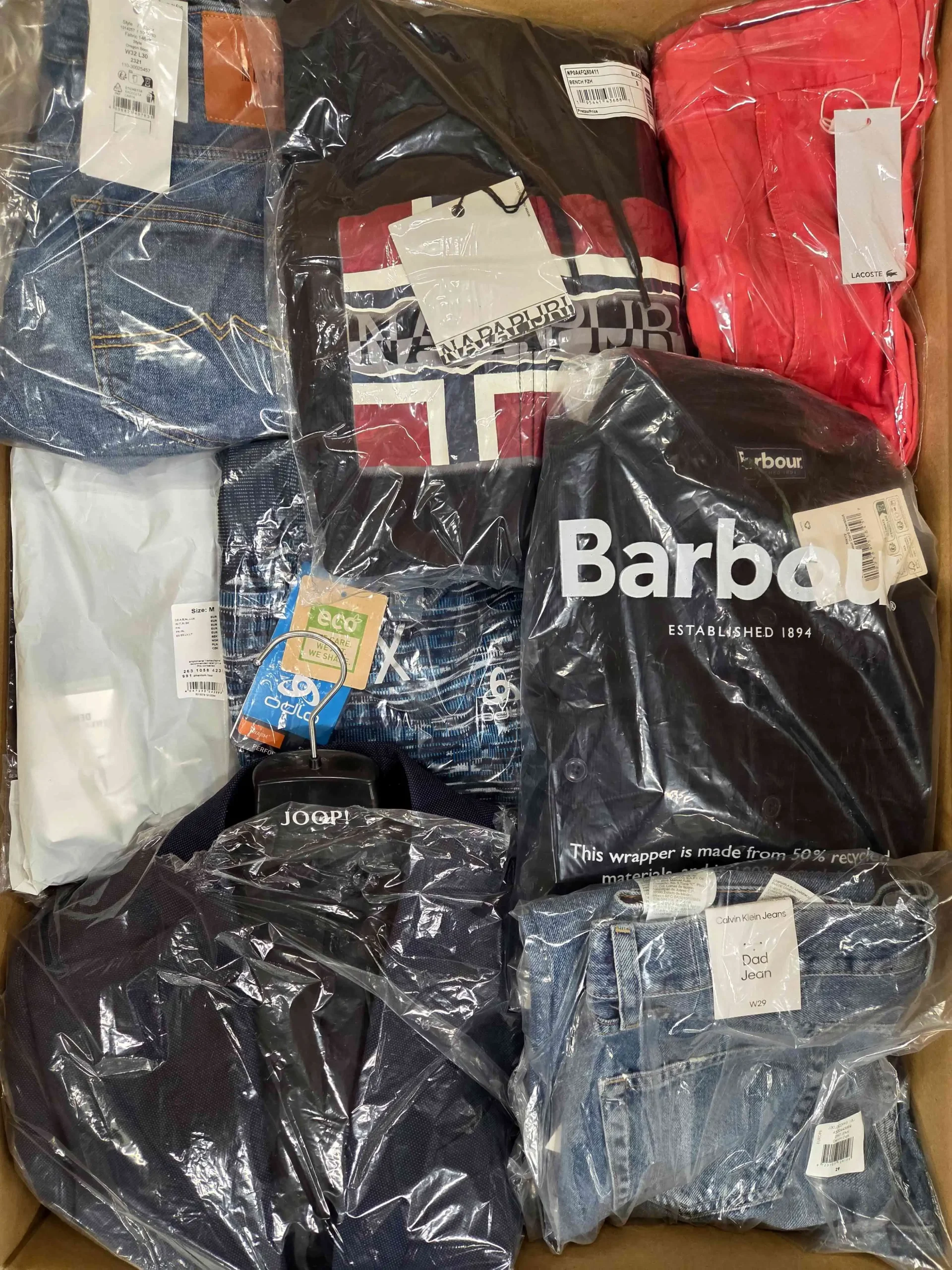 Pakiet odzieży męskiej zawierający mix marek w kategorii jakościowej A. Ok. 100% pakietu z metką papierową, a około 40% to najbardziej rozpoznawalne marki. Pokazana wierzchnia warstwa jest zawartością tego pakietu oraz przedstawia najlepsze marki.