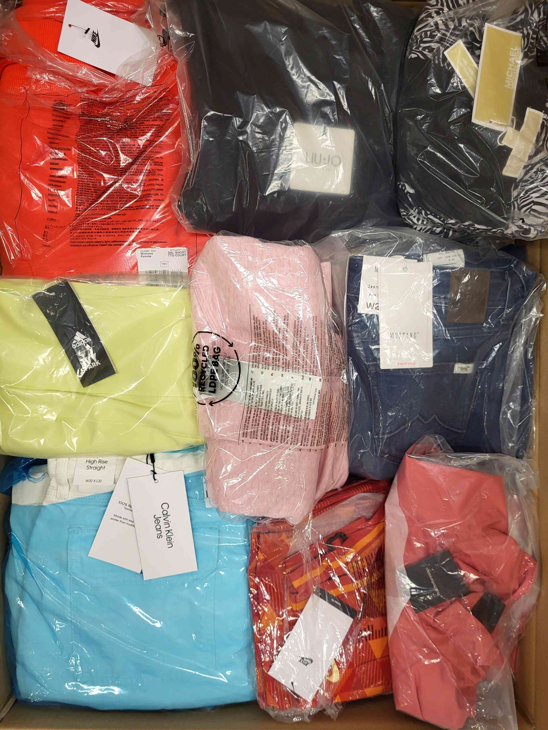 Pakiet odzieży damskiej zawierający mix marek w kategorii jakościowej A. Ok. 100% pakietu z metką papierową, a 25% to najbardziej rozpoznawalne marki. Pokazana wierzchnia warstwa jest zawartością tego pakietu oraz przedstawia najlepsze marki.
