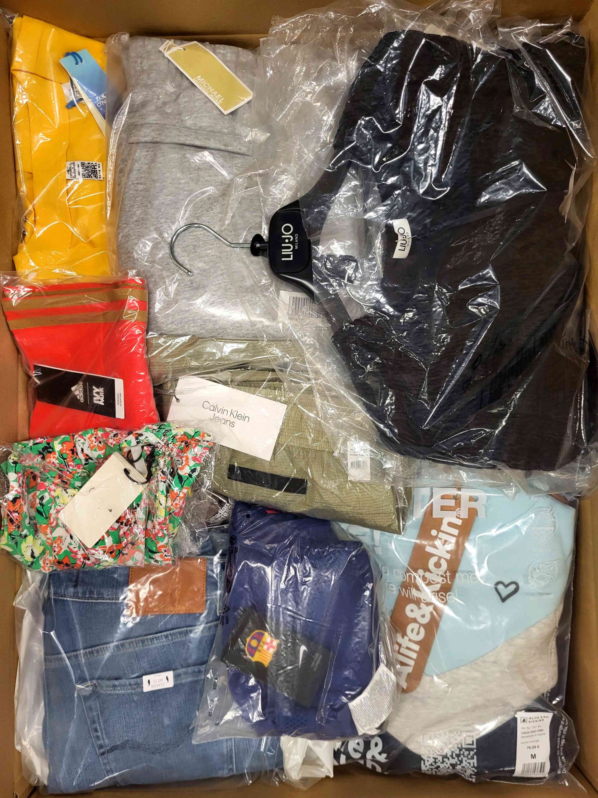 Pakiet odzieży damskiej zawierający mix marek w kategorii jakościowej A. Ok. 100% pakietu z metką papierową, a 25% to najbardziej rozpoznawalne marki. Pokazana wierzchnia warstwa jest zawartością tego pakietu oraz przedstawia najlepsze marki.