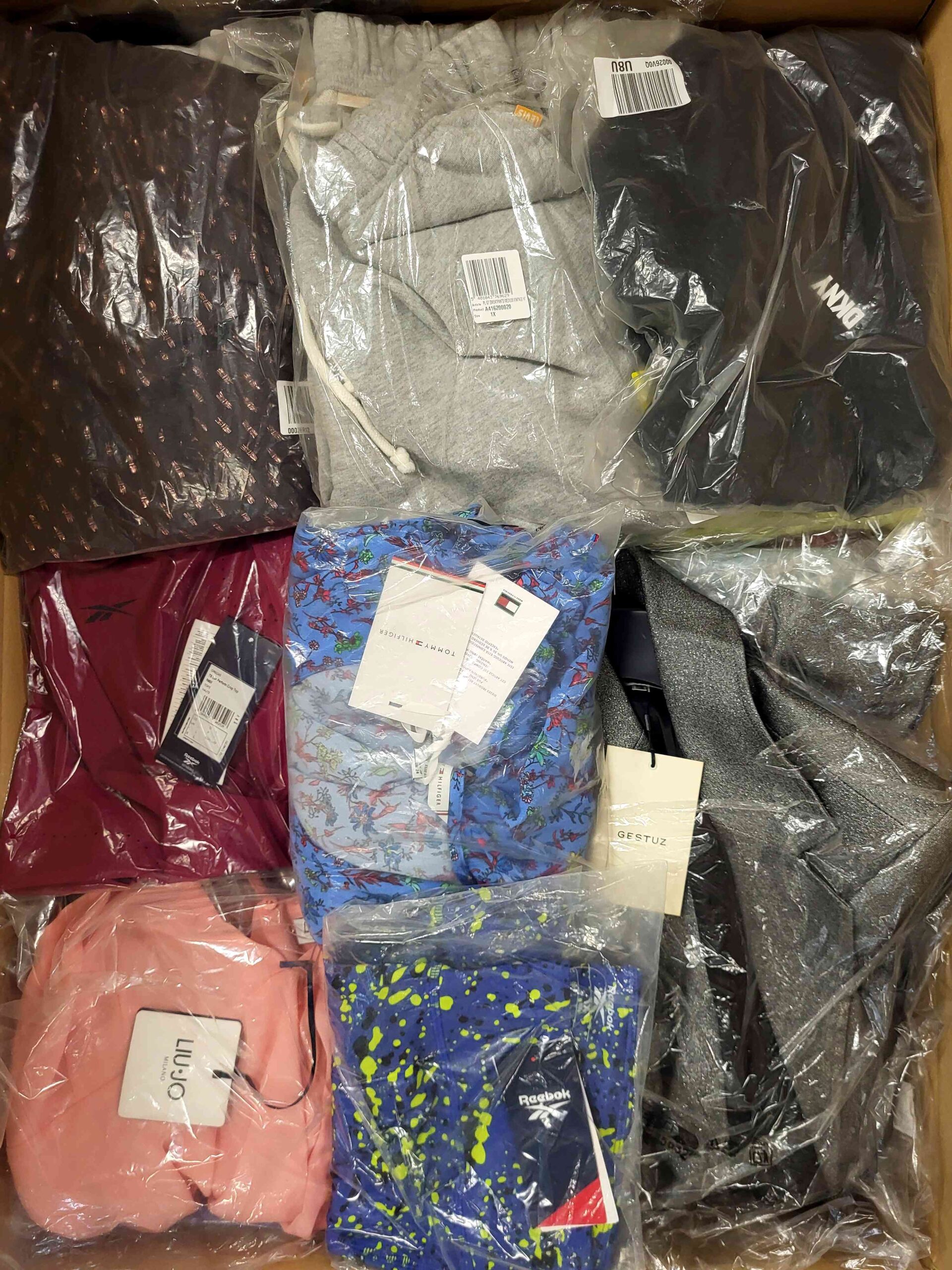 Pakiet odzieży damskiej zawierający mix marek w kategorii jakościowej A. Ok. 100% pakietu z metką papierową, a 25% to najbardziej rozpoznawalne marki. Pokazana wierzchnia warstwa jest zawartością tego pakietu oraz przedstawia najlepsze marki.