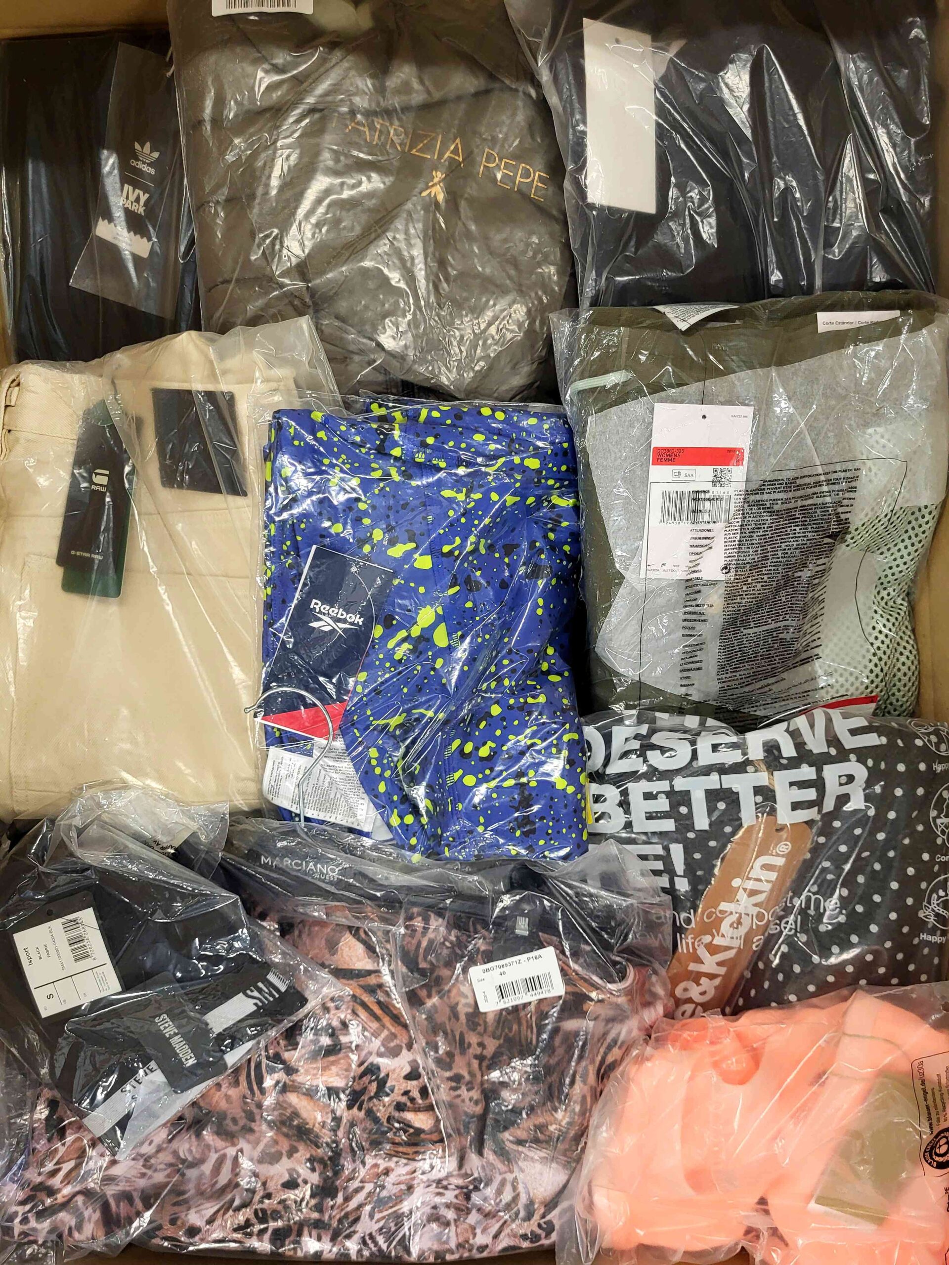 Pakiet odzieży damskiej zawierający mix marek w kategorii jakościowej A. Ok. 100% pakietu z metką papierową, a 25% to najbardziej rozpoznawalne marki. Pokazana wierzchnia warstwa jest zawartością tego pakietu oraz przedstawia najlepsze marki.