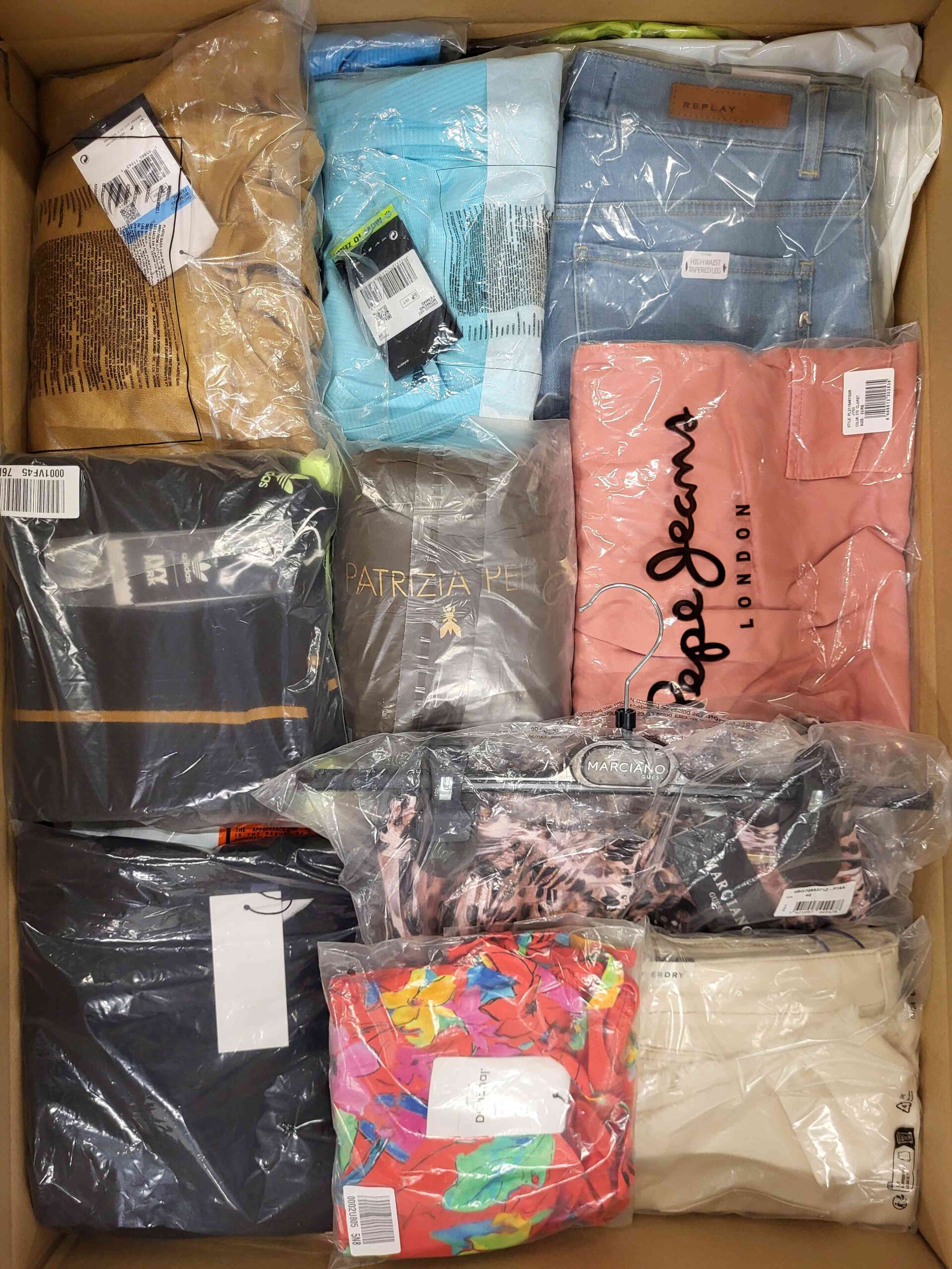 Pakiet odzieży damskiej zawierający mix marek w kategorii jakościowej A. Ok. 100% pakietu z metką papierową, a 25% to najbardziej rozpoznawalne marki. Pokazana wierzchnia warstwa jest zawartością tego pakietu oraz przedstawia najlepsze marki.