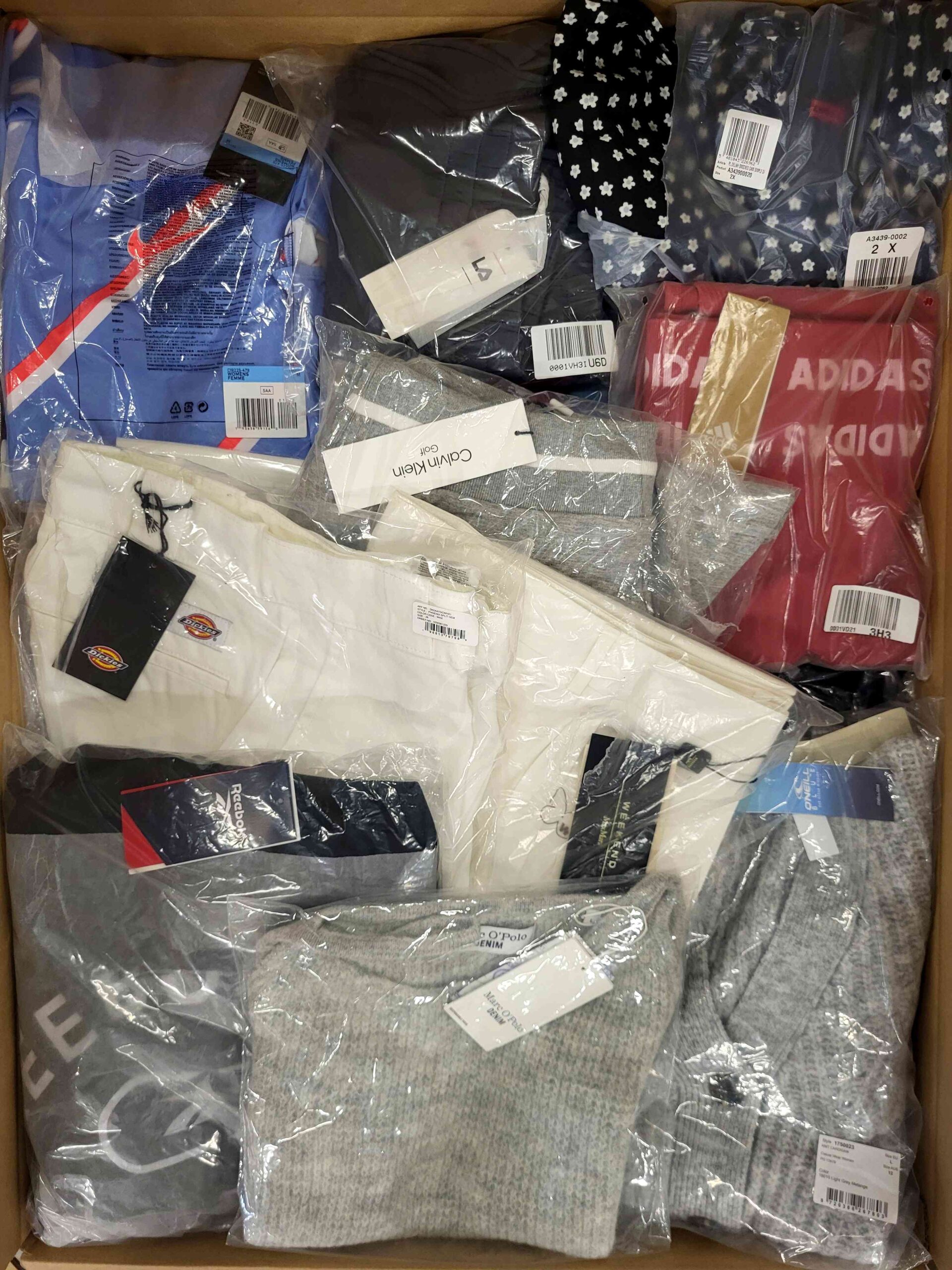 Pakiet odzieży damskiej zawierający mix marek w kategorii jakościowej A. Ok. 100% pakietu z metką papierową, a 25% to najbardziej rozpoznawalne marki. Pokazana wierzchnia warstwa jest zawartością tego pakietu oraz przedstawia najlepsze marki.