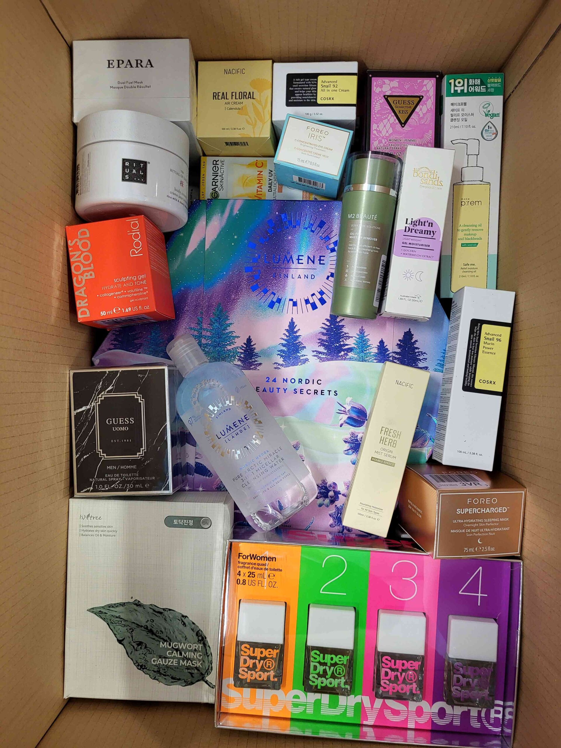 W środku znajdują się produkty/akcesoria beauty takie jak: kremy, balsamy, tusze do rzęs, cienie do powiek, toniki, balsamy, błyszczyki, pomadki, korektory, akcesoria do pielęgnacji itp.