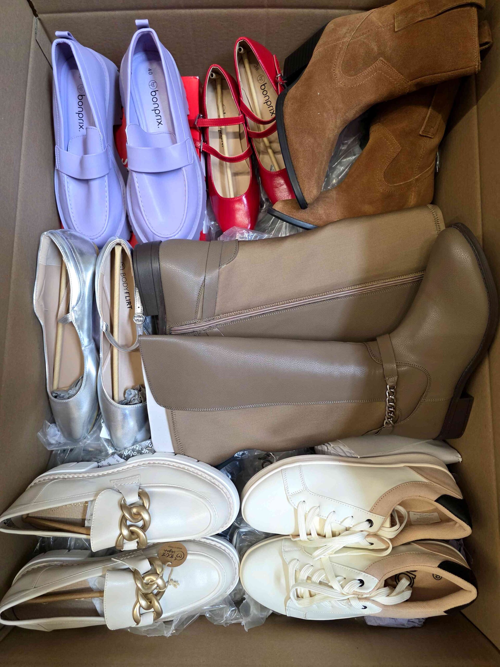Pakiet 25 par butów – mix damskich, męskich modeli. Różne rozmiary i sezony. Kategoria A/B – drobne, prawie niewidoczne wady. Większość obuwia w bardzo dobrym stanie.