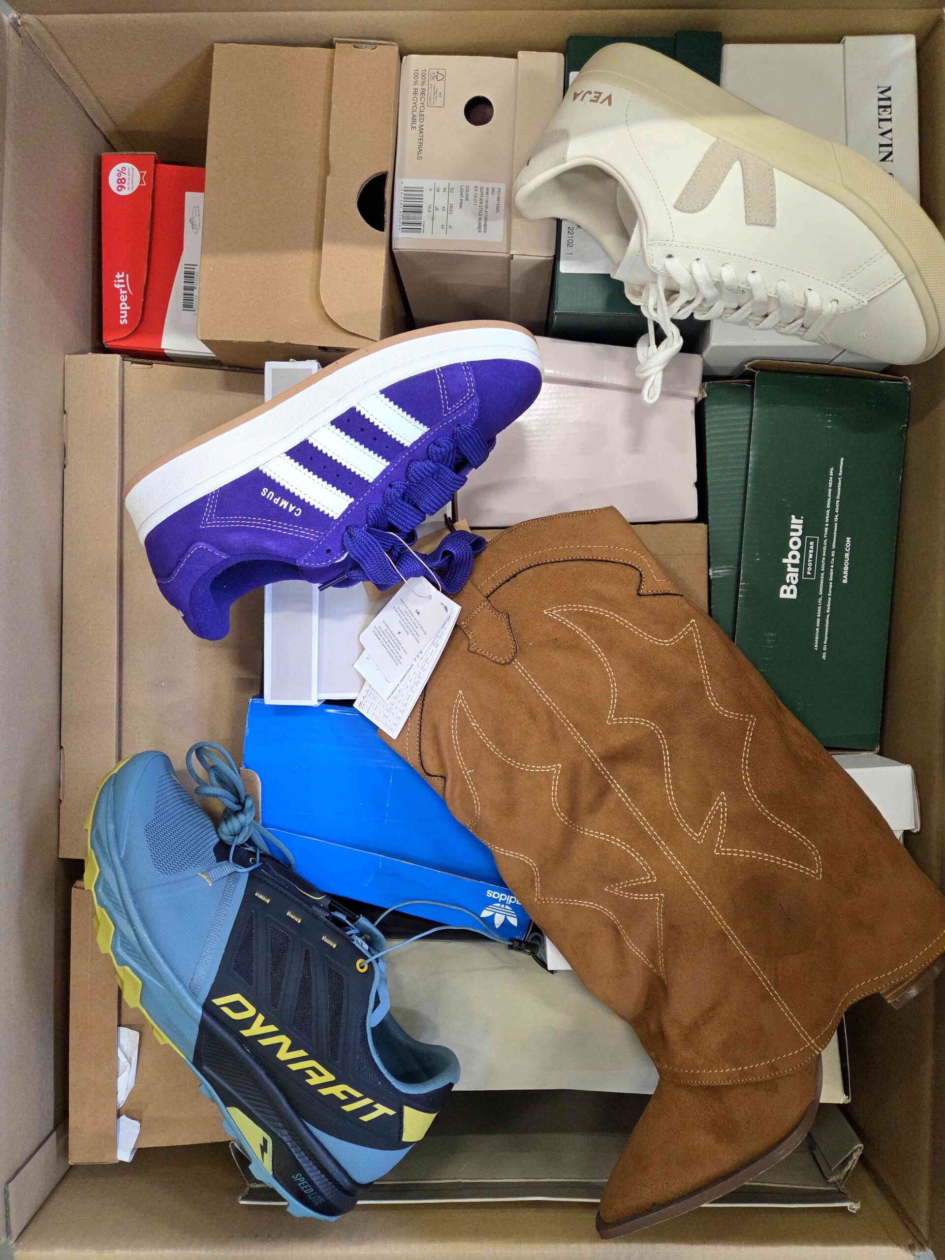 Produkt posiada minimalne, odwracalne ślady użytkowania(przybrudzenia) lub małe wady producenta. Obuwie zapakowane jest w oryginalne lub zastępcze kartony. W skład pakietu wchodzi 100% oryginalne obuwie, które nie jest dzielone ze względu na sezonowość. Mogą wystąpić modele zarówno zimowe, jak i letnie. W pakiecie może znajdować się obuwie męskie, damskie oraz dziecięce.