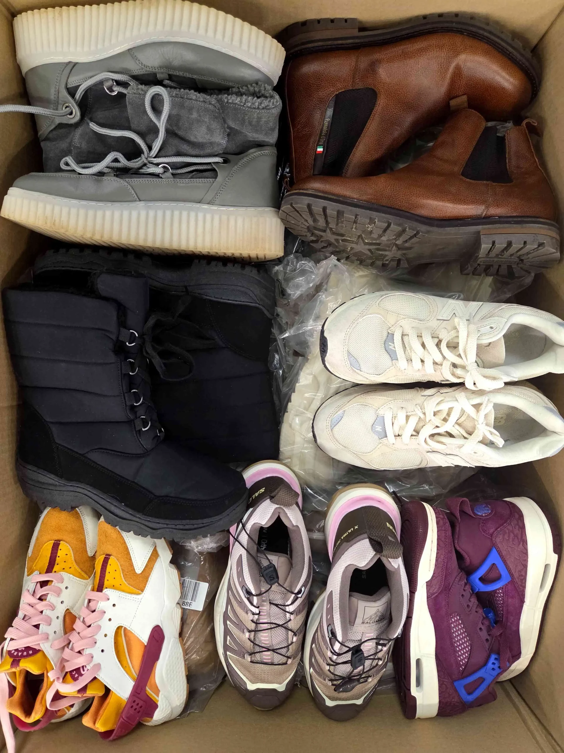 Obuwie posiada widoczne ślady użytkowania lub defekty (pęknięta siatka, rozklejona podeszwa, przybrudzenia, zepsuty zamek, rozdarta zapiętka, rozcięcia, pęknięcia materiału, brak wkładki, odbarwienia, brak sznurówek, itp.). Część defektów nie do naprawy. Najlepsze marki wybrane do zdjęcia. Obuwie nie posiada oryginalnych opakowań i w większości zapakowane jest w przezroczyste worki. Mogą wystąpić modele zarówno zimowe, jak i letnie.