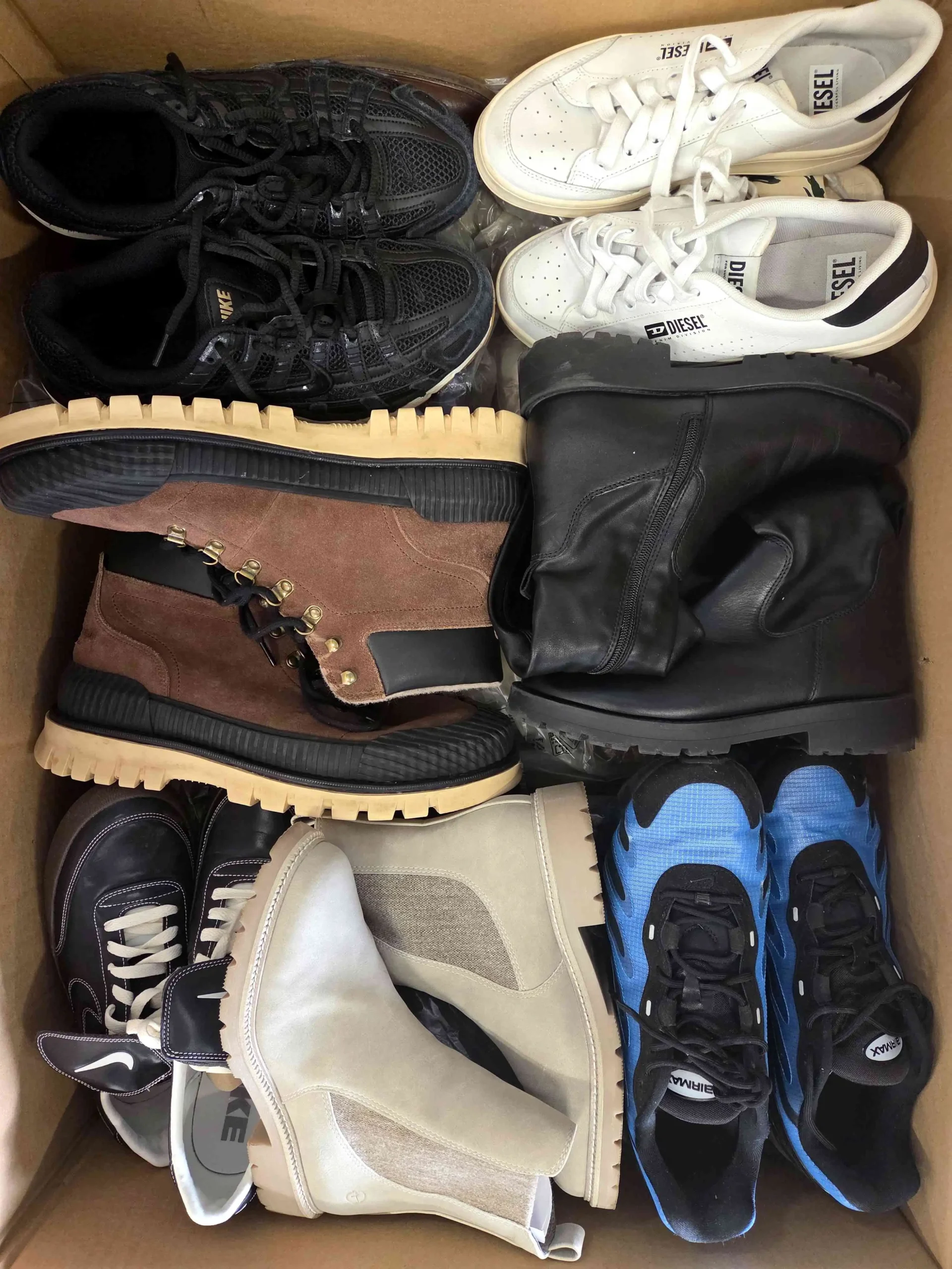 Obuwie posiada widoczne ślady użytkowania lub defekty (pęknięta siatka, rozklejona podeszwa, przybrudzenia, zepsuty zamek, rozdarta zapiętka, rozcięcia, pęknięcia materiału, brak wkładki, odbarwienia, brak sznurówek, itp.). Część defektów nie do naprawy. Najlepsze marki wybrane do zdjęcia. Obuwie nie posiada oryginalnych opakowań i w większości zapakowane jest w przezroczyste worki. Mogą wystąpić modele zarówno zimowe, jak i letnie.