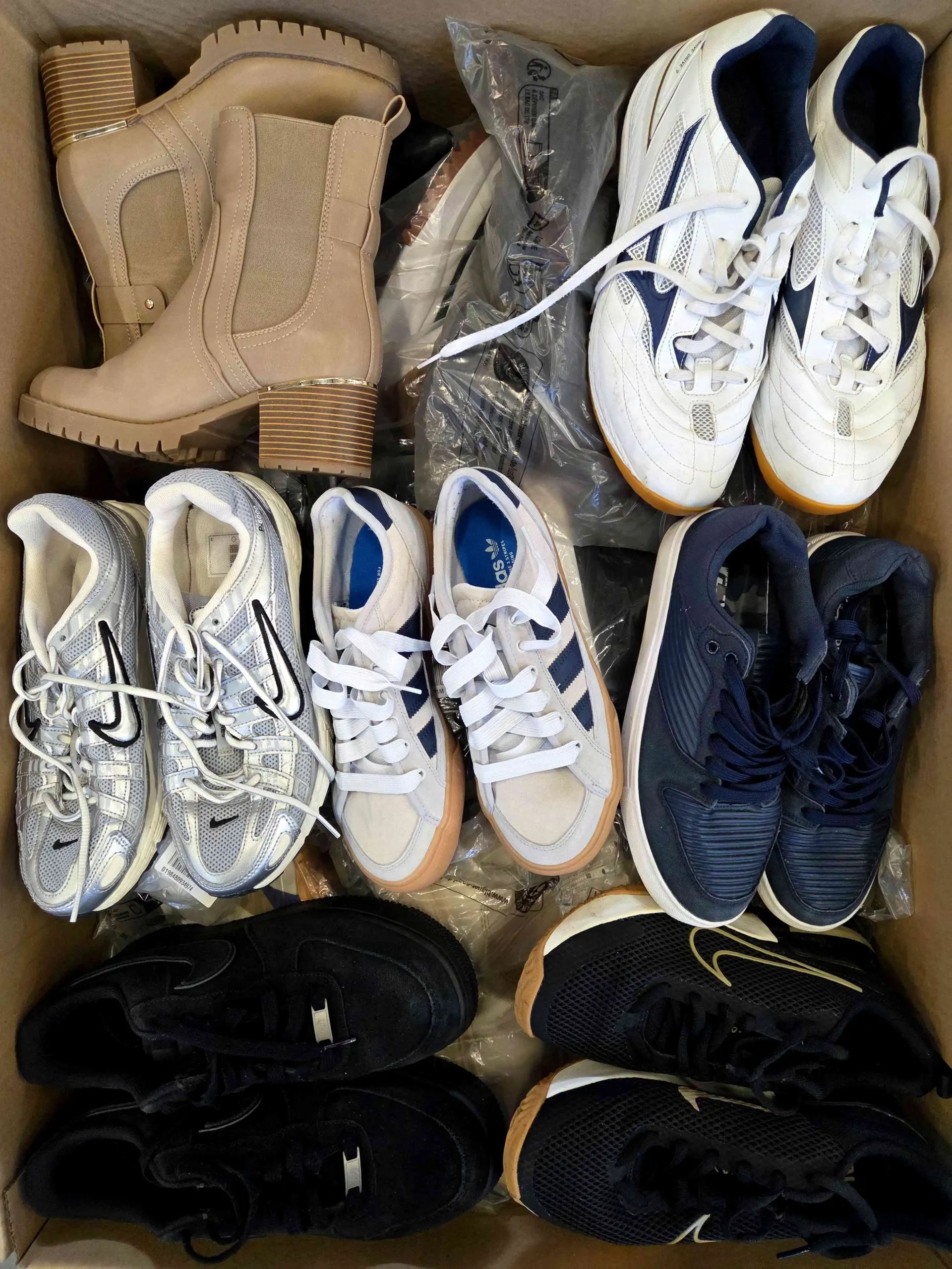 Obuwie posiada widoczne ślady użytkowania lub defekty (pęknięta siatka, rozklejona podeszwa, przybrudzenia, zepsuty zamek, rozdarta zapiętka, rozcięcia, pęknięcia materiału, brak wkładki, odbarwienia, brak sznurówek, itp.). Część defektów nie do naprawy. Najlepsze marki wybrane do zdjęcia. Obuwie nie posiada oryginalnych opakowań i w większości zapakowane jest w przezroczyste worki. Mogą wystąpić modele zarówno zimowe, jak i letnie.