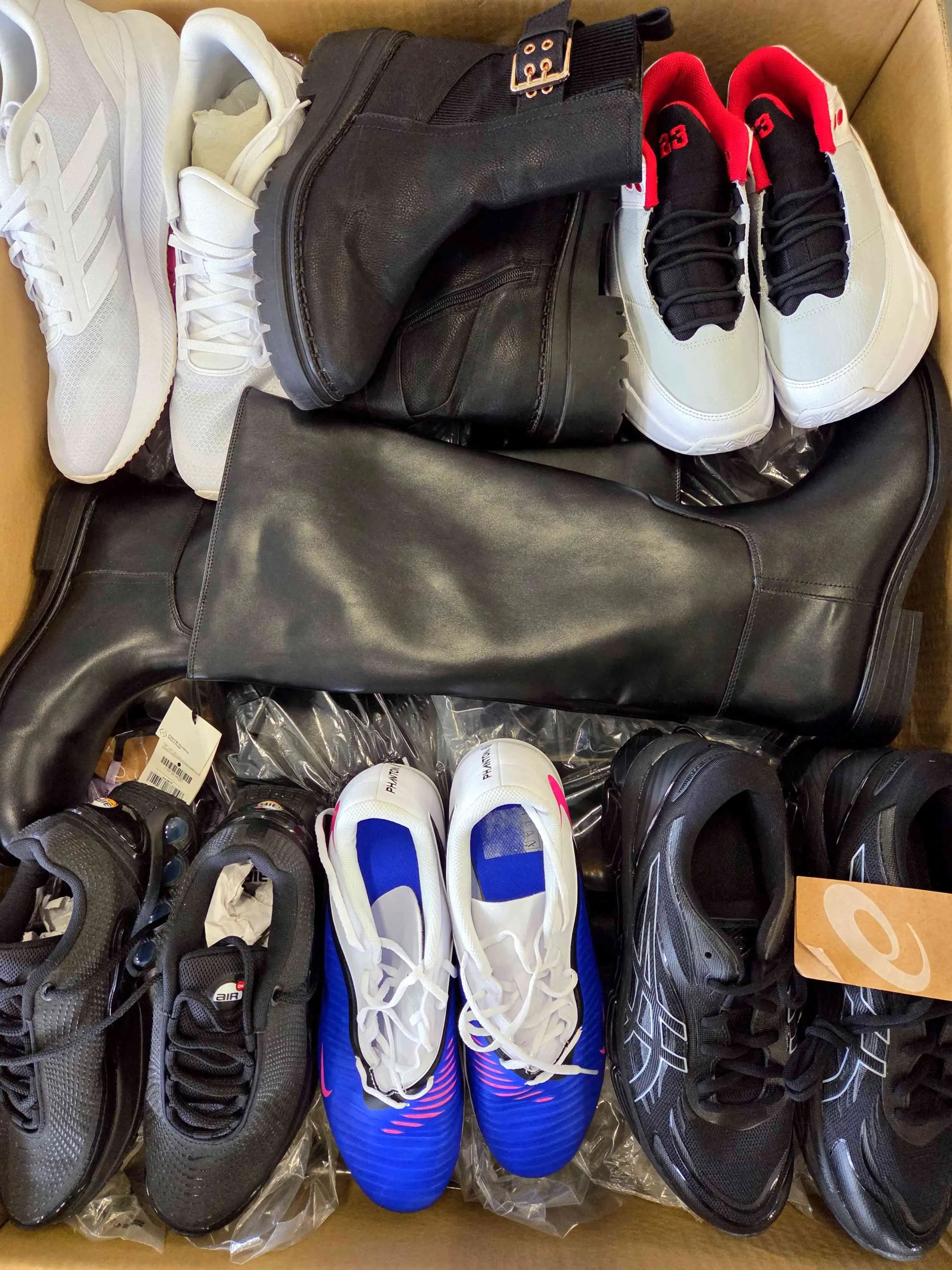 Obuwie posiada widoczne ślady użytkowania lub defekty (pęknięta siatka, rozklejona podeszwa, przybrudzenia, zepsuty zamek, rozdarta zapiętka, rozcięcia, pęknięcia materiału, brak wkładki, odbarwienia, brak sznurówek, itp.). Część defektów nie do naprawy. Najlepsze marki wybrane do zdjęcia. Obuwie nie posiada oryginalnych opakowań i w większości zapakowane jest w przezroczyste worki. Mogą wystąpić modele zarówno zimowe, jak i letnie.