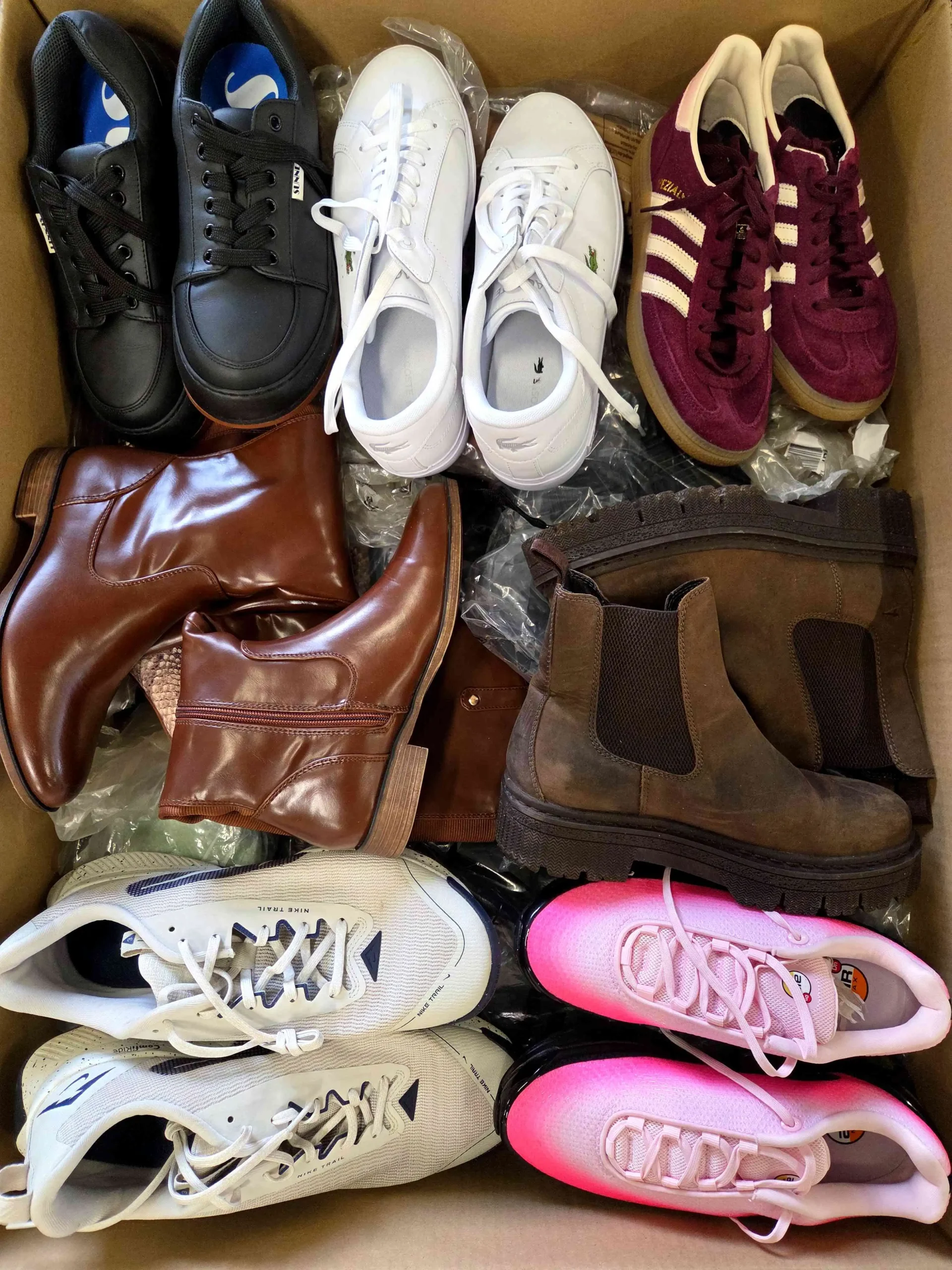 Obuwie posiada widoczne ślady użytkowania lub defekty (pęknięta siatka, rozklejona podeszwa, przybrudzenia, zepsuty zamek, rozdarta zapiętka, rozcięcia, pęknięcia materiału, brak wkładki, odbarwienia, brak sznurówek, itp.). Część defektów nie do naprawy. Najlepsze marki wybrane do zdjęcia. Obuwie nie posiada oryginalnych opakowań i w większości zapakowane jest w przezroczyste worki. Mogą wystąpić modele zarówno zimowe, jak i letnie.