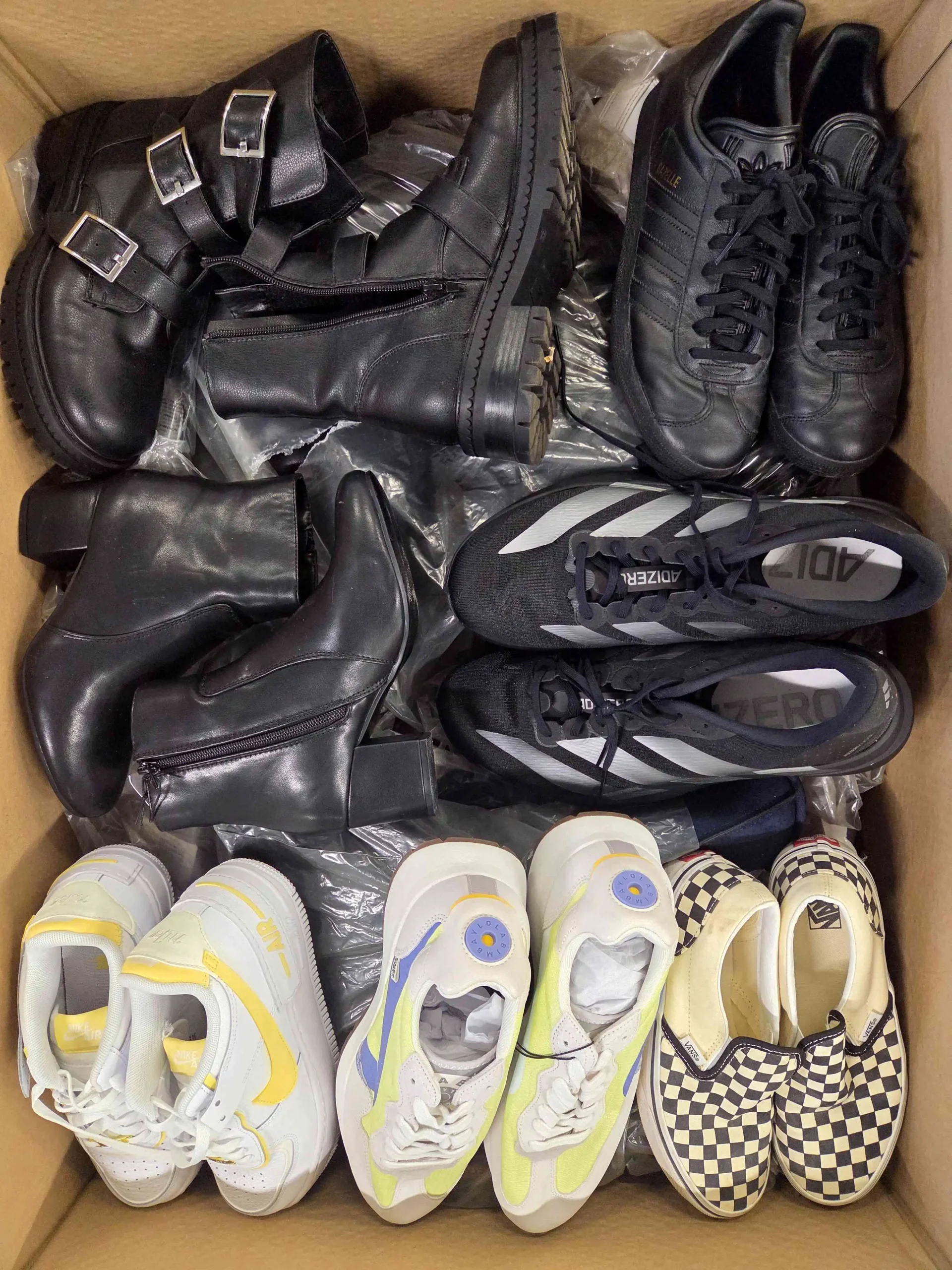 Obuwie posiada widoczne ślady użytkowania lub defekty (pęknięta siatka, rozklejona podeszwa, przybrudzenia, zepsuty zamek, rozdarta zapiętka, rozcięcia, pęknięcia materiału, brak wkładki, odbarwienia, brak sznurówek, itp.). Część defektów nie do naprawy. Najlepsze marki wybrane do zdjęcia. Obuwie nie posiada oryginalnych opakowań i w większości zapakowane jest w przezroczyste worki. Mogą wystąpić modele zarówno zimowe, jak i letnie.