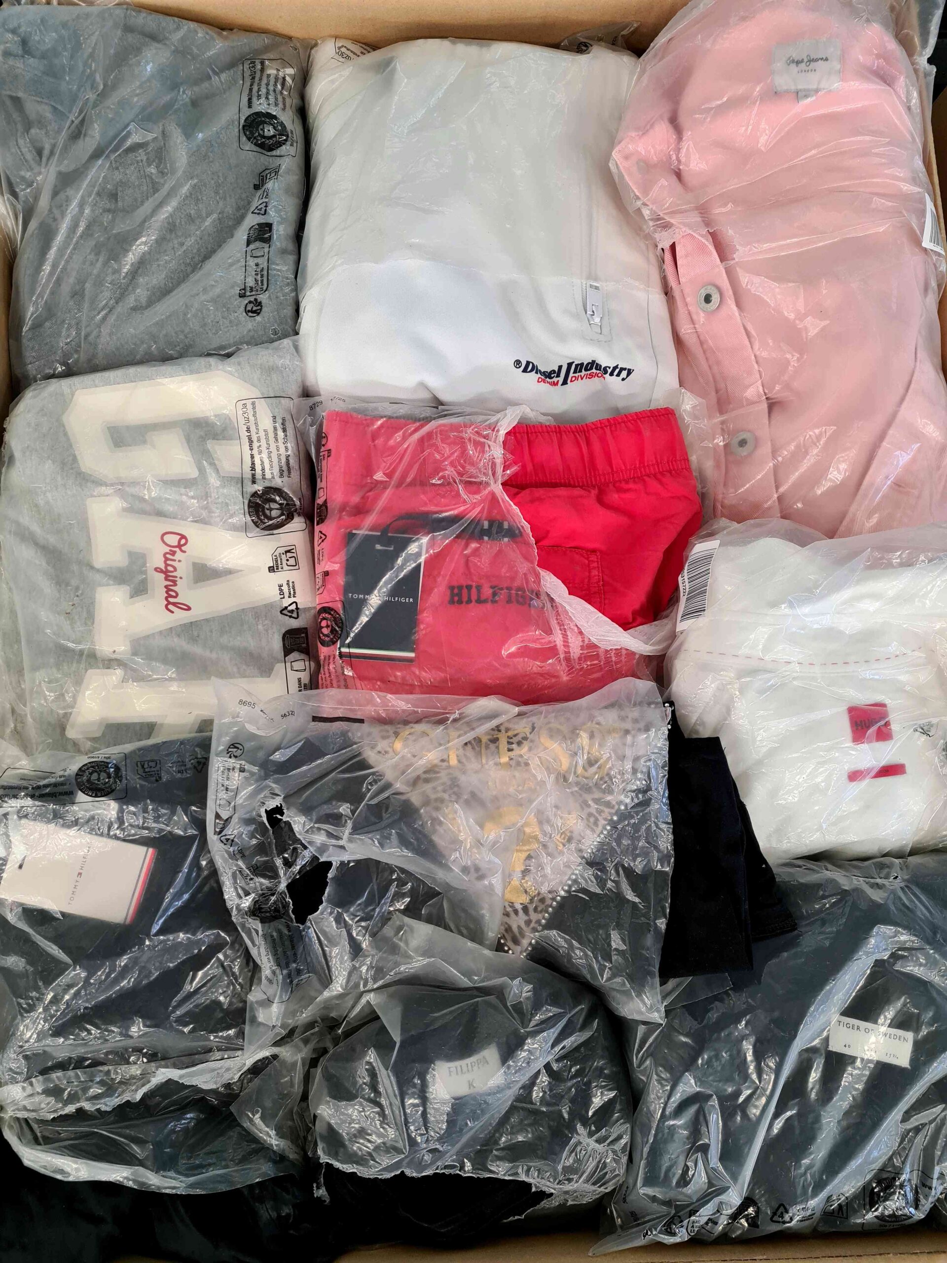 Pakiet średnio zawiera około 70szt. odzieży tj. bielizna, swetry, koszulki, koszule, spodnie, stroje kąpielowe, kurtki, bluzy, sukienki.