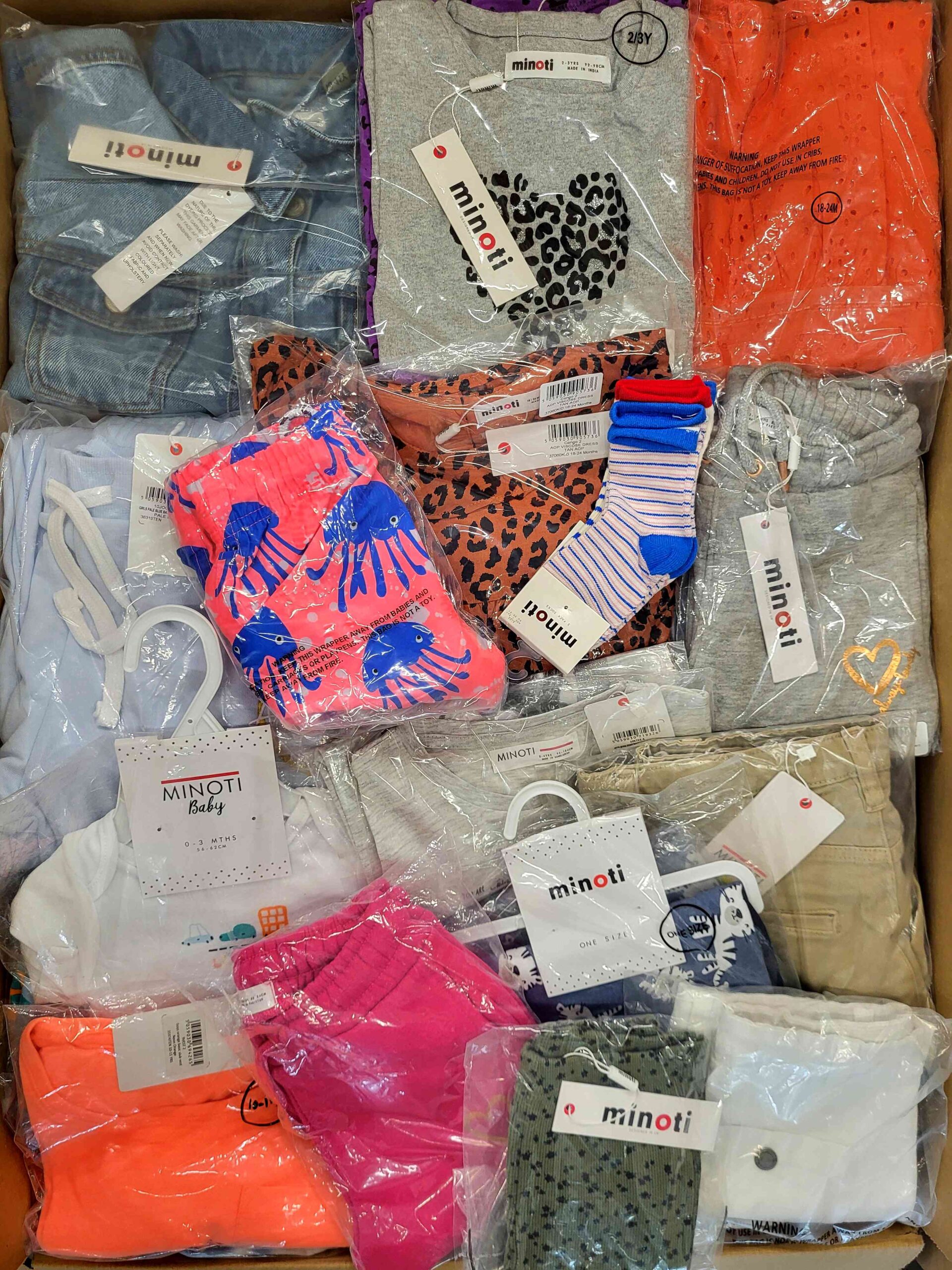 Pakiet odzieży dziecięcej marki Minotti składa się z około 100 sztuk nowych, oryginalnych ubrań przeznaczonych dla dzieci w wieku od 3 miesięcy do 14 lat.