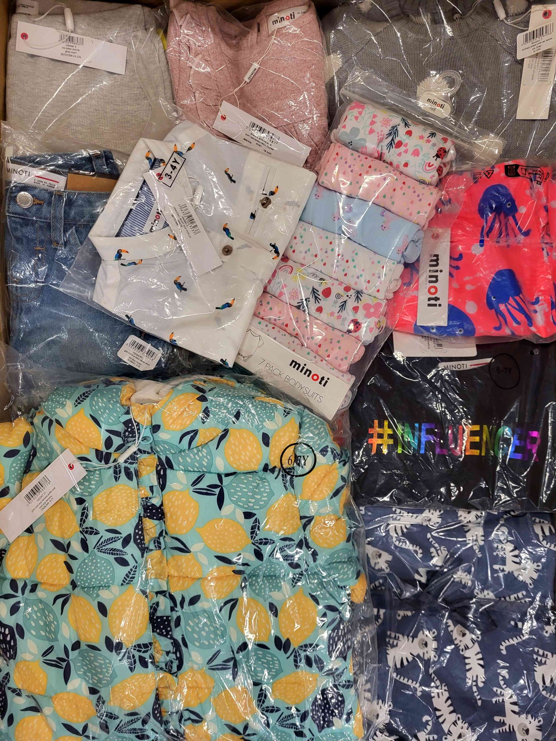 Pakiet odzieży dziecięcej marki Minotti składa się z około 100 sztuk nowych, oryginalnych ubrań przeznaczonych dla dzieci w wieku od 3 miesięcy do 14 lat.