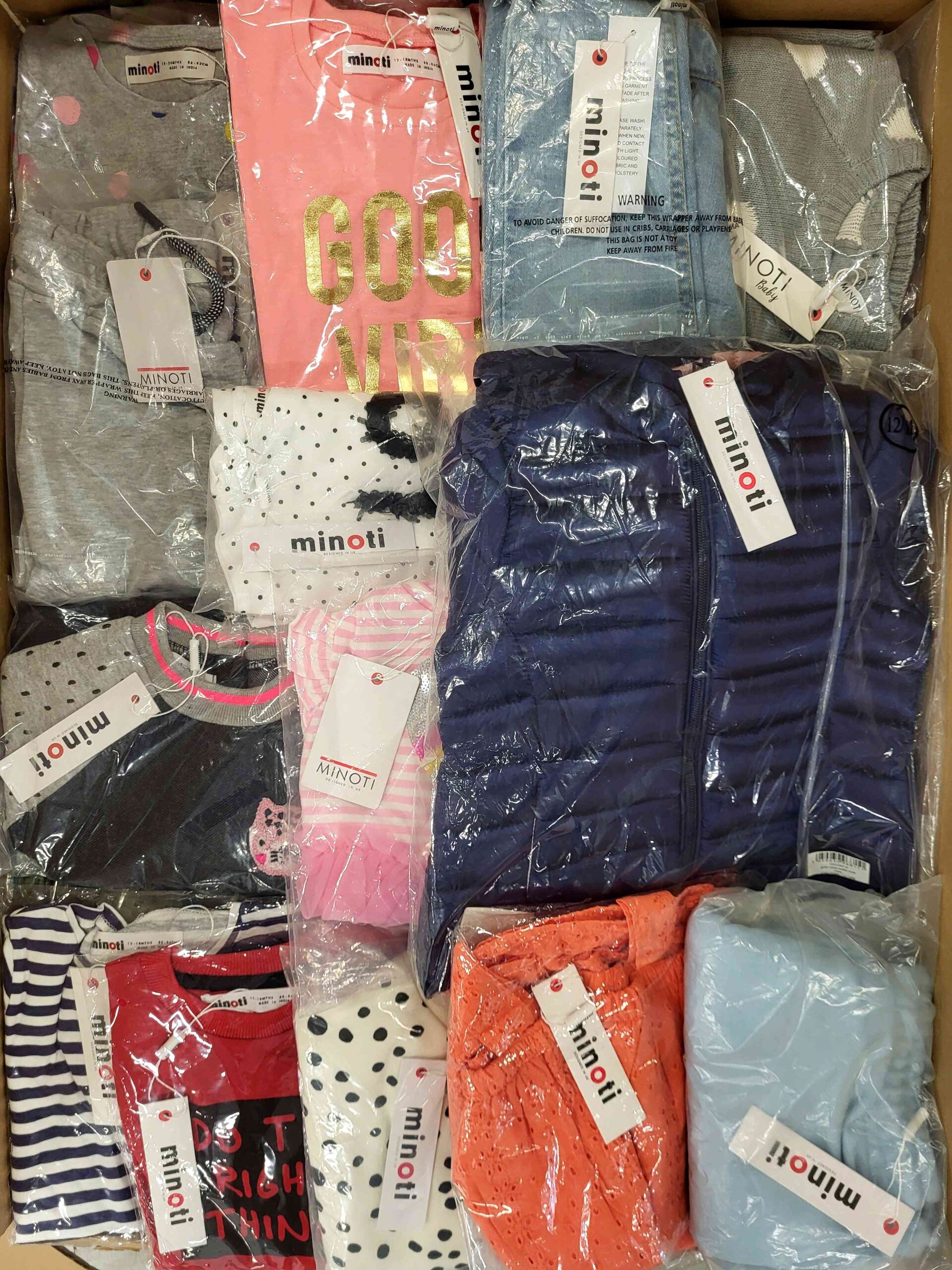 Pakiet odzieży dziecięcej marki Minoti składa się z około 100 sztuk nowych, oryginalnych ubrań przeznaczonych dla dzieci w wieku od 3 miesięcy do 14 lat.