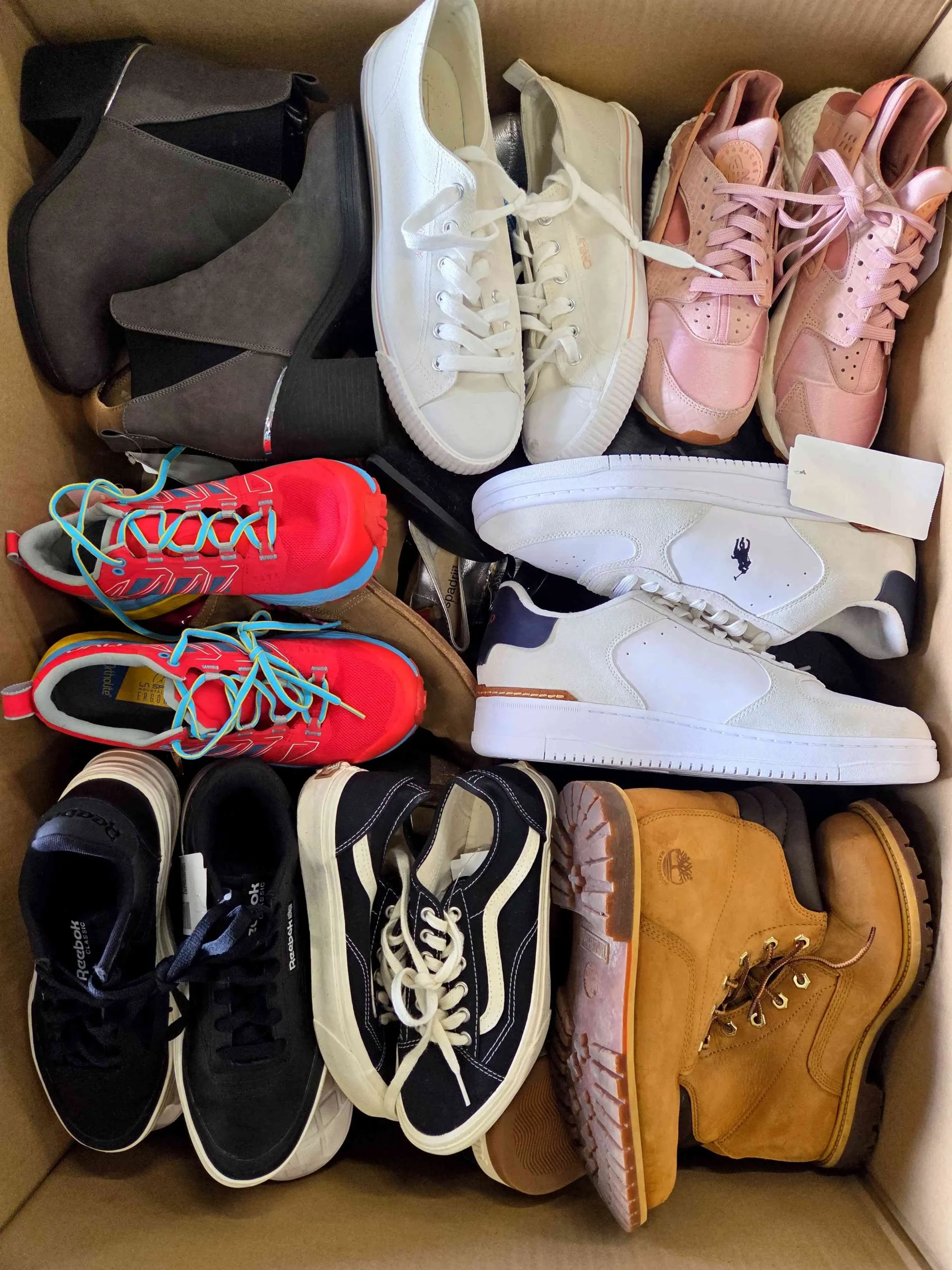 Obuwie posiada widoczne ślady użytkowania oraz defekty (pęknięta siatka, rozklejona podeszwa, przybrudzenia, zepsuty zamek, rozdarta zapiętka, rozcięcia, pęknięcia materiału, brak wkładki, odbarwienia, brak sznurówek, błedna rozmiarówka, itp.).