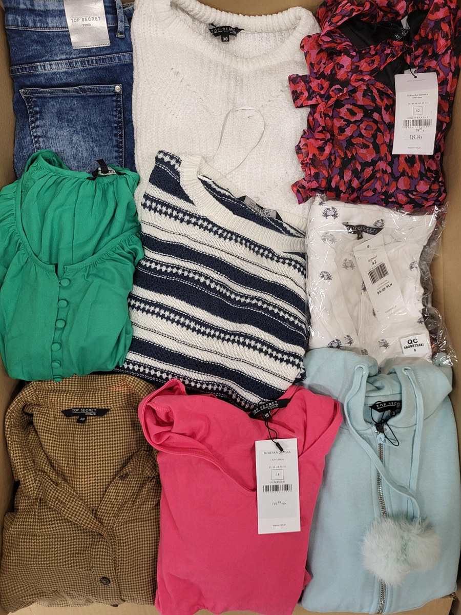 Pakiet w kategorii C ze znacznymi śladami użytkowania lub wadami. Pokazana górna warstwa to zawartość tego opakowania. Pakiet zawiera około 75 sztuk z czego 80% to odzież damska, 7% odzież męska, 13% odzież dziecięca oraz akcesoria.