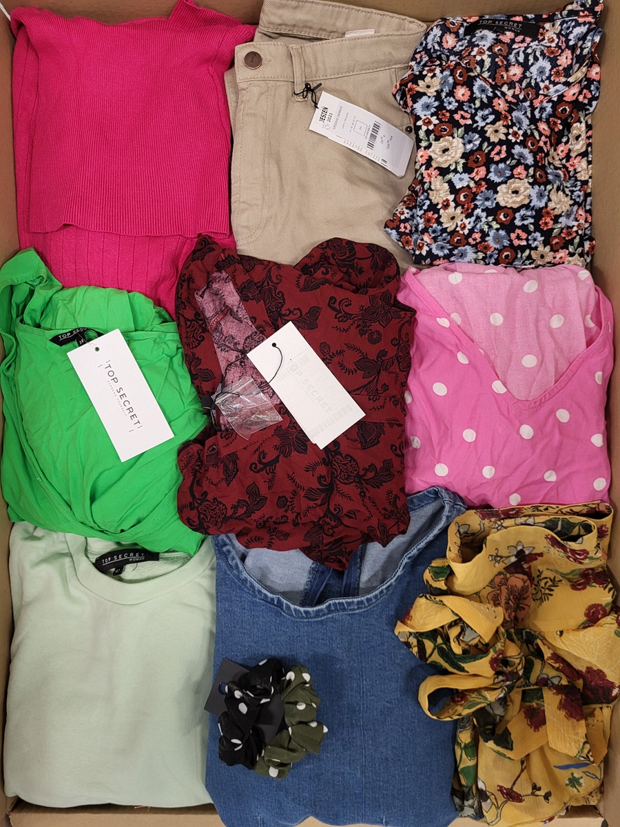 Pakiet w kategorii C ze znacznymi śladami użytkowania lub wadami. Pokazana górna warstwa to zawartość tego opakowania. Pakiet zawiera około 75 sztuk z czego 80% to odzież damska, 7% odzież męska, 13% odzież dziecięca oraz akcesoria.
