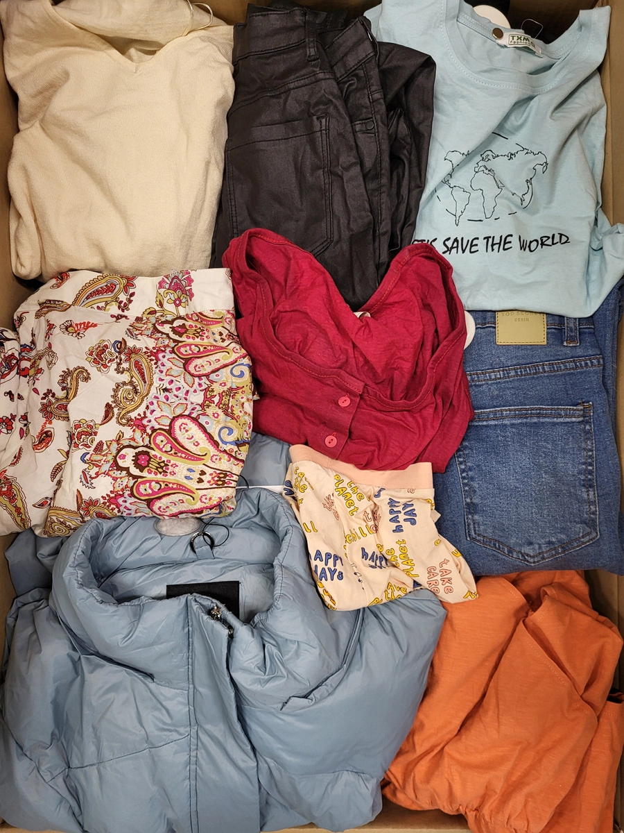 Pakiet w kategorii C ze znacznymi śladami użytkowania lub wadami. Pokazana górna warstwa to zawartość tego opakowania. Pakiet zawiera około 75 sztuk z czego 80% to odzież damska, 7% odzież męska, 13% odzież dziecięca oraz akcesoria.