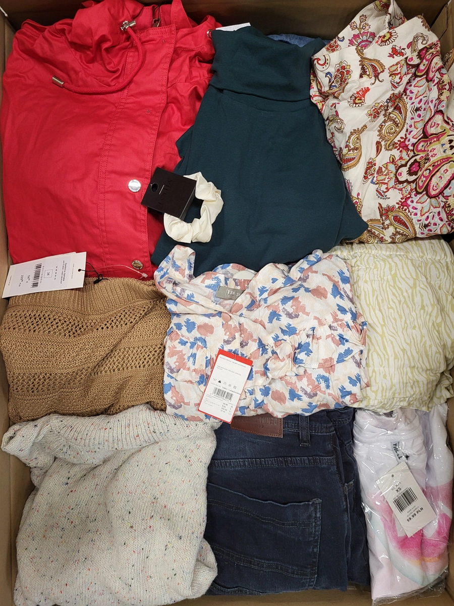 Pakiet w kategorii C ze znacznymi śladami użytkowania lub wadami. Pokazana górna warstwa to zawartość tego opakowania. Pakiet zawiera około 75 sztuk z czego 80% to odzież damska, 7% odzież męska, 13% odzież dziecięca oraz akcesoria.