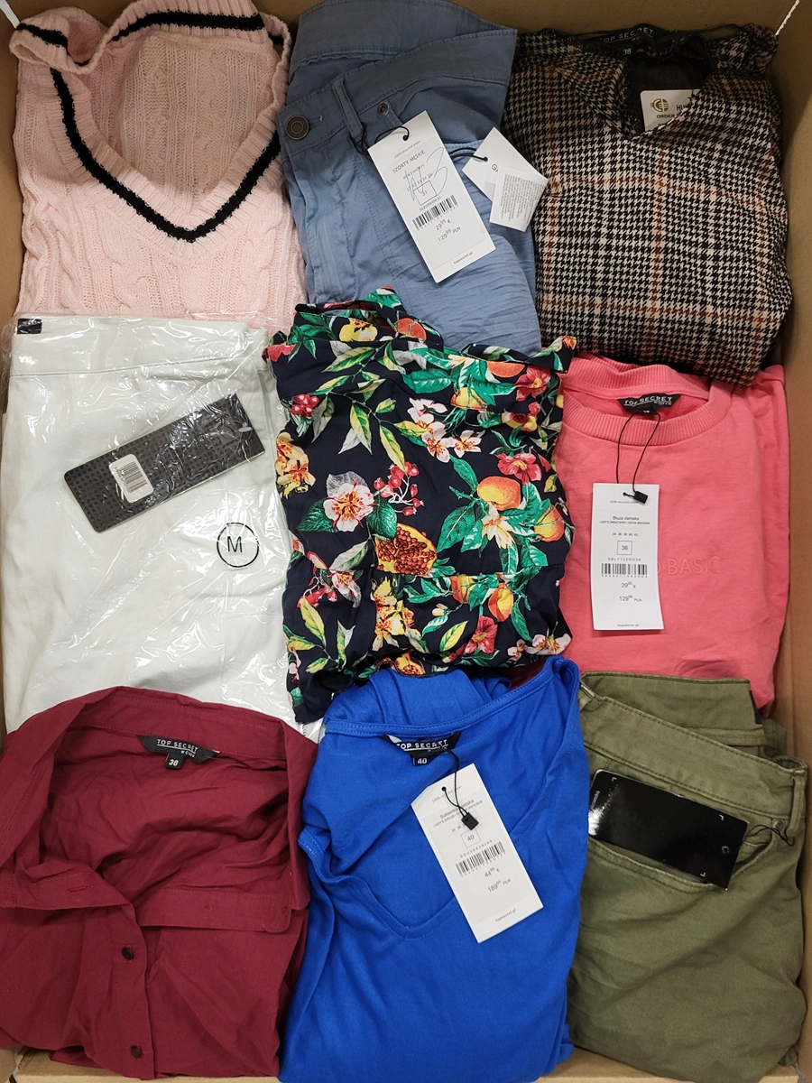 Pakiet w kategorii C ze znacznymi śladami użytkowania lub wadami. Pokazana górna warstwa to zawartość tego opakowania. Pakiet zawiera około 75 sztuk z czego 80% to odzież damska, 7% odzież męska, 13% odzież dziecięca oraz akcesoria.