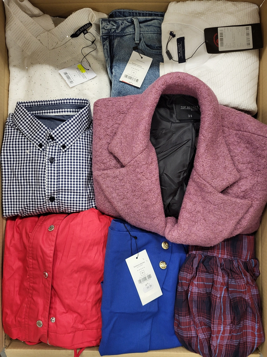 Pakiet w kategorii C ze znacznymi śladami użytkowania lub wadami. Pokazana górna warstwa to zawartość tego opakowania. Pakiet zawiera około 75 sztuk z czego 80% to odzież damska, 7% odzież męska, 13% odzież dziecięca oraz akcesoria.