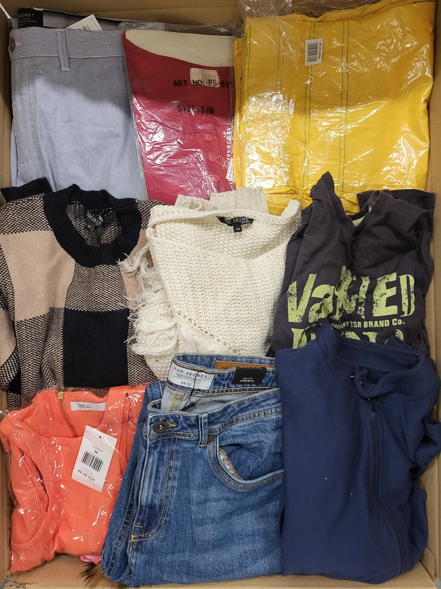 Pakiet w kategorii C ze znacznymi śladami użytkowania lub wadami. Pokazana górna warstwa to zawartość tego opakowania. Pakiet zawiera około 75 sztuk z czego 80% to odzież damska, 7% odzież męska, 13% odzież dziecięca oraz akcesoria.
