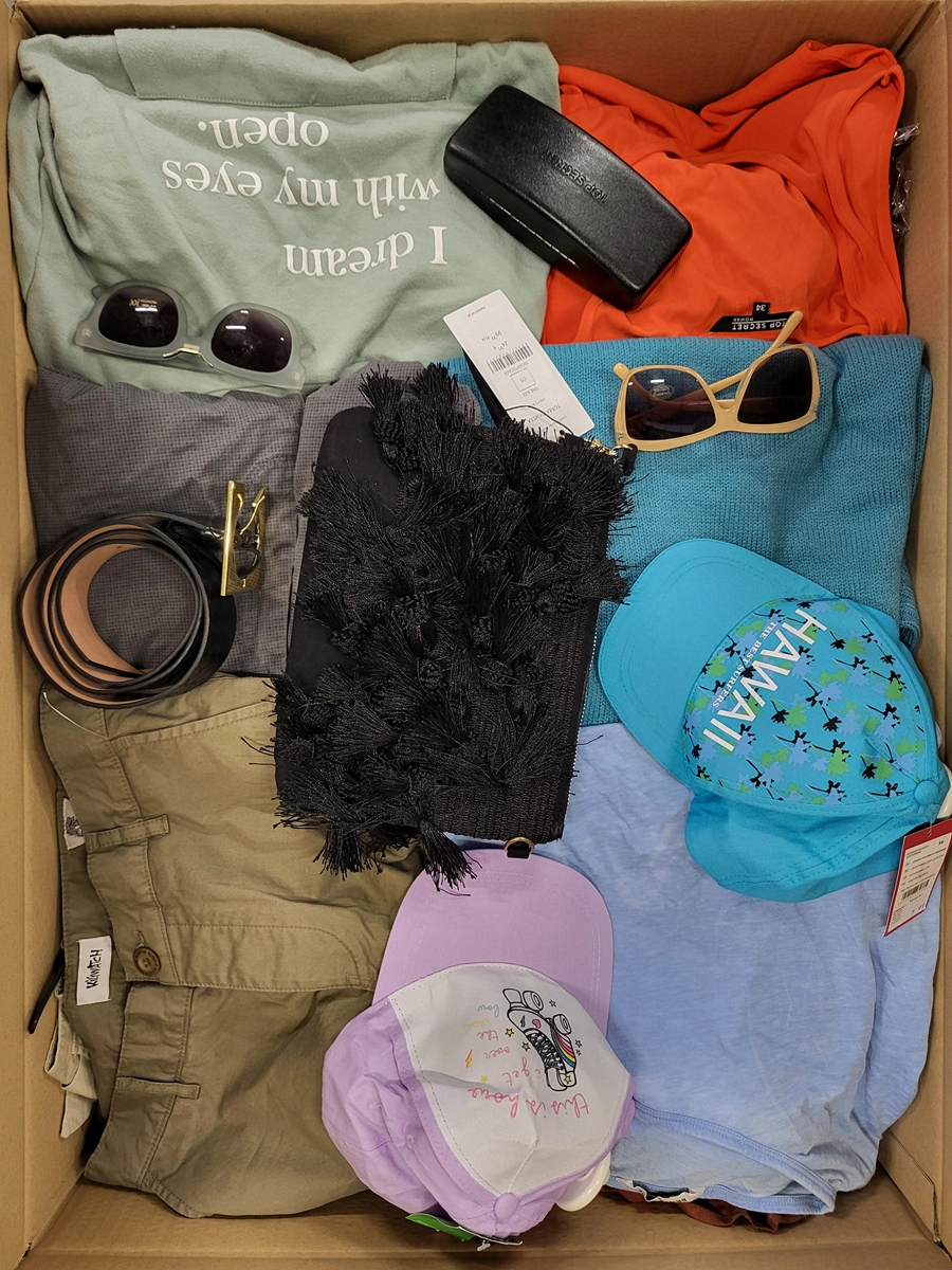 Pakiet w kategorii C ze znacznymi śladami użytkowania lub wadami. Pokazana górna warstwa to zawartość tego opakowania. Pakiet zawiera około 75 sztuk z czego 80% to odzież damska, 7% odzież męska, 13% odzież dziecięca oraz akcesoria.