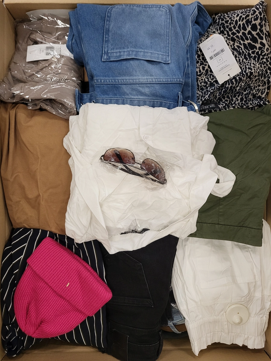 Pakiet w kategorii C ze znacznymi śladami użytkowania lub wadami. Pokazana górna warstwa to zawartość tego opakowania. Pakiet zawiera około 75 sztuk z czego 80% to odzież damska, 7% odzież męska, 13% odzież dziecięca oraz akcesoria.