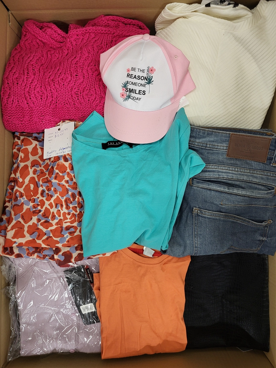 Pakiet w kategorii C ze znacznymi śladami użytkowania lub wadami. Pokazana górna warstwa to zawartość tego opakowania. Pakiet zawiera około 75 sztuk z czego 80% to odzież damska, 7% odzież męska, 13% odzież dziecięca oraz akcesoria.