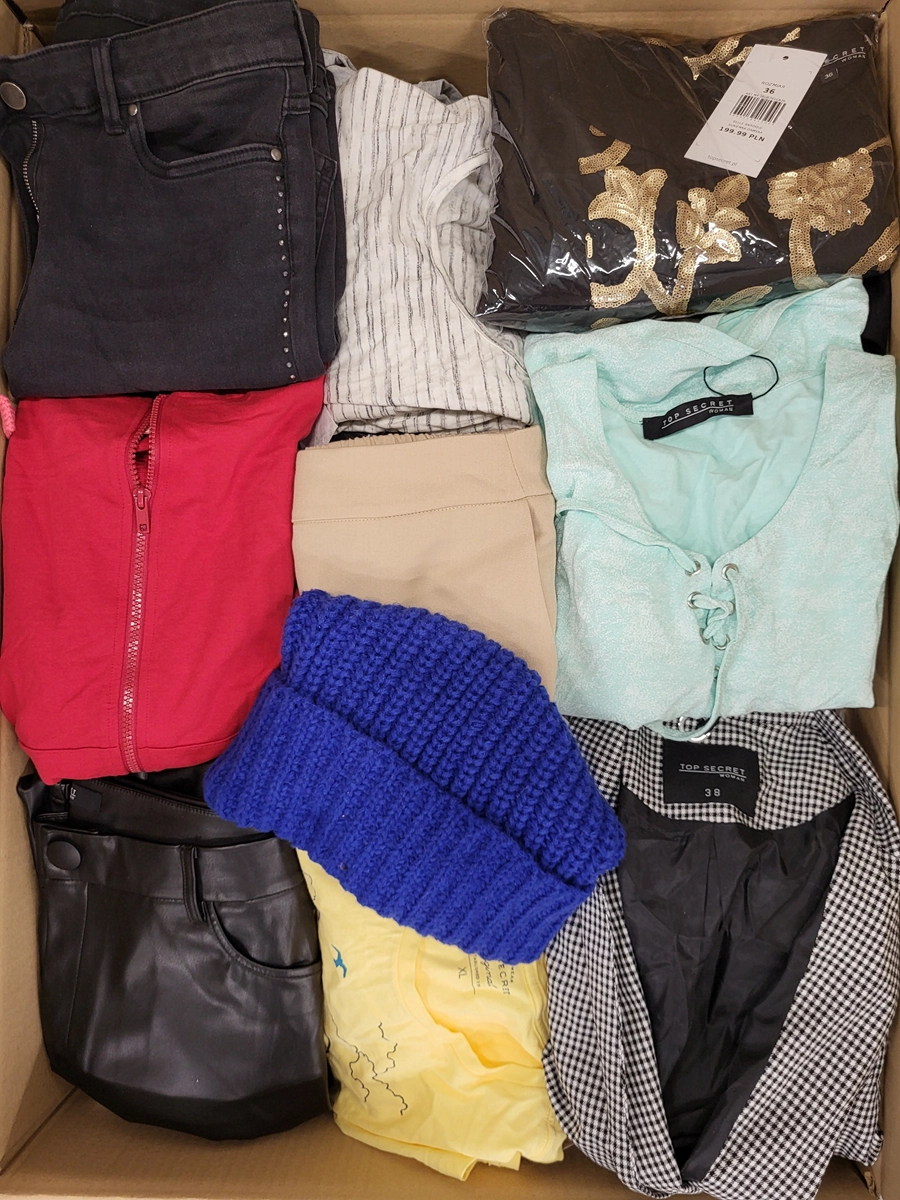 Pakiet w kategorii C ze znacznymi śladami użytkowania lub wadami. Pokazana górna warstwa to zawartość tego opakowania. Pakiet zawiera około 75 sztuk z czego 80% to odzież damska, 7% odzież męska, 13% odzież dziecięca oraz akcesoria.