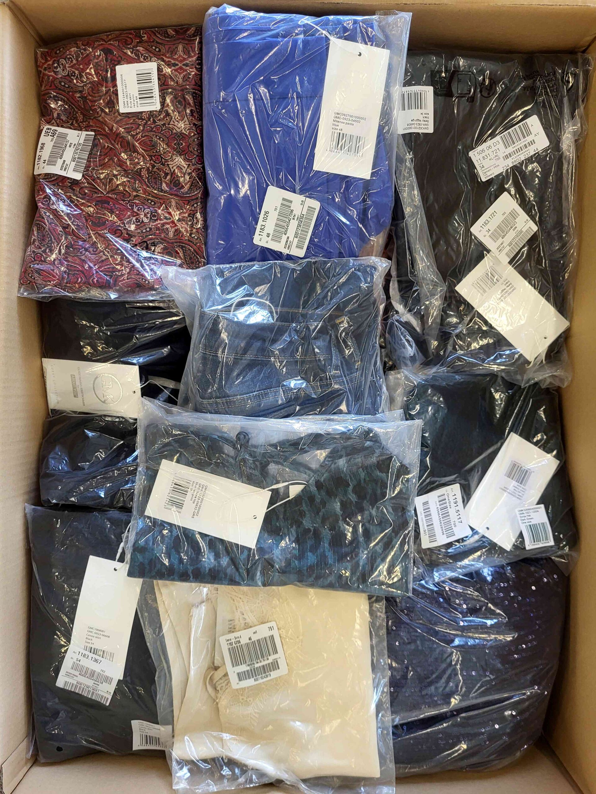 W skład pakietu wchodzi ok. 30 szt. odzieży damskiej m.in. kurtki, płaszcze, swetry, bluzy, spodnie, sukienki, bluzki, topy, paski, torebki, skarpety. W pakiecie może znaleźć się odzież męska.