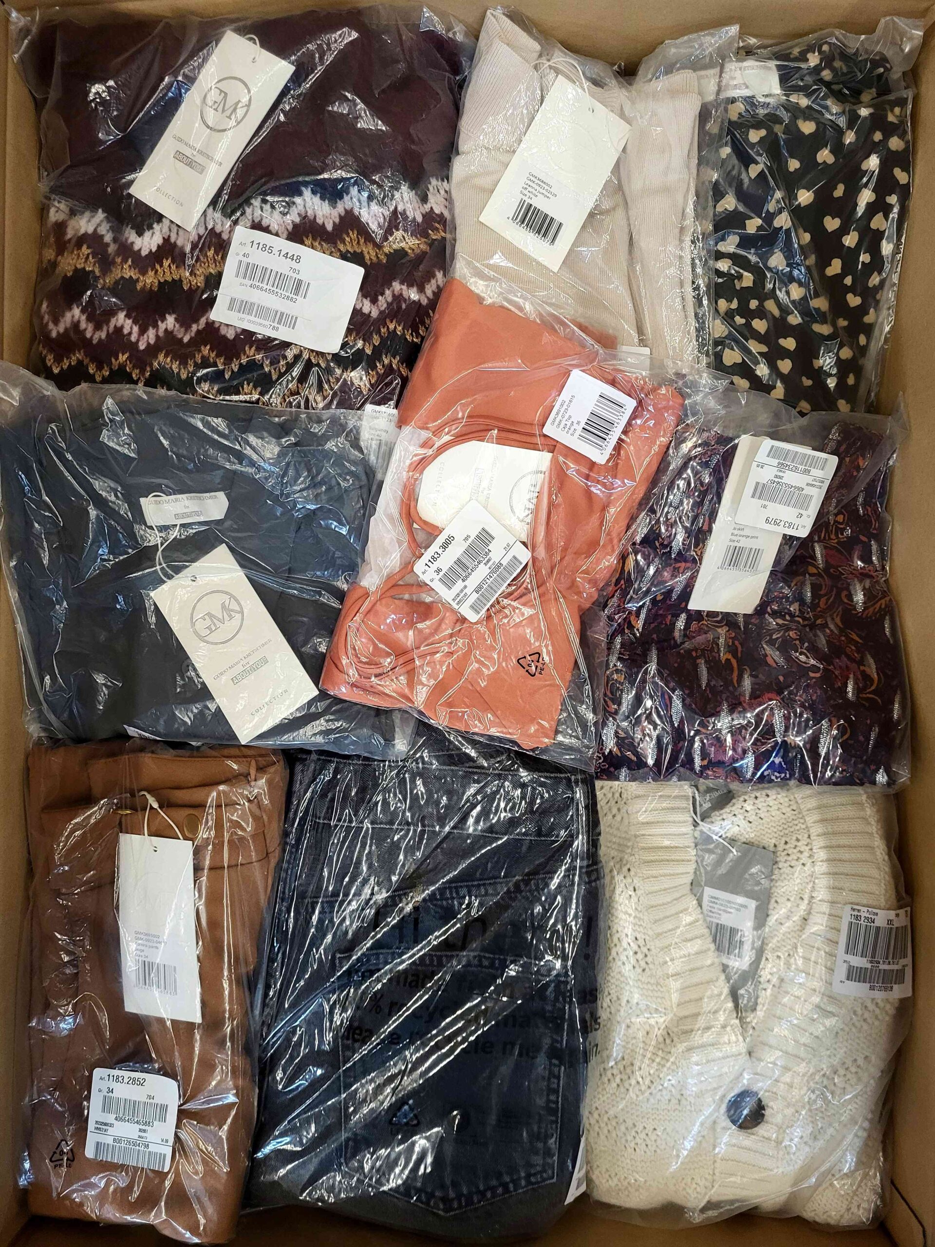 W skład pakietu wchodzi ok. 30 szt. odzieży damskiej m.in. kurtki, płaszcze, swetry, bluzy, spodnie, sukienki, bluzki, topy, paski, torebki, skarpety. W pakiecie może znaleźć się odzież męska.