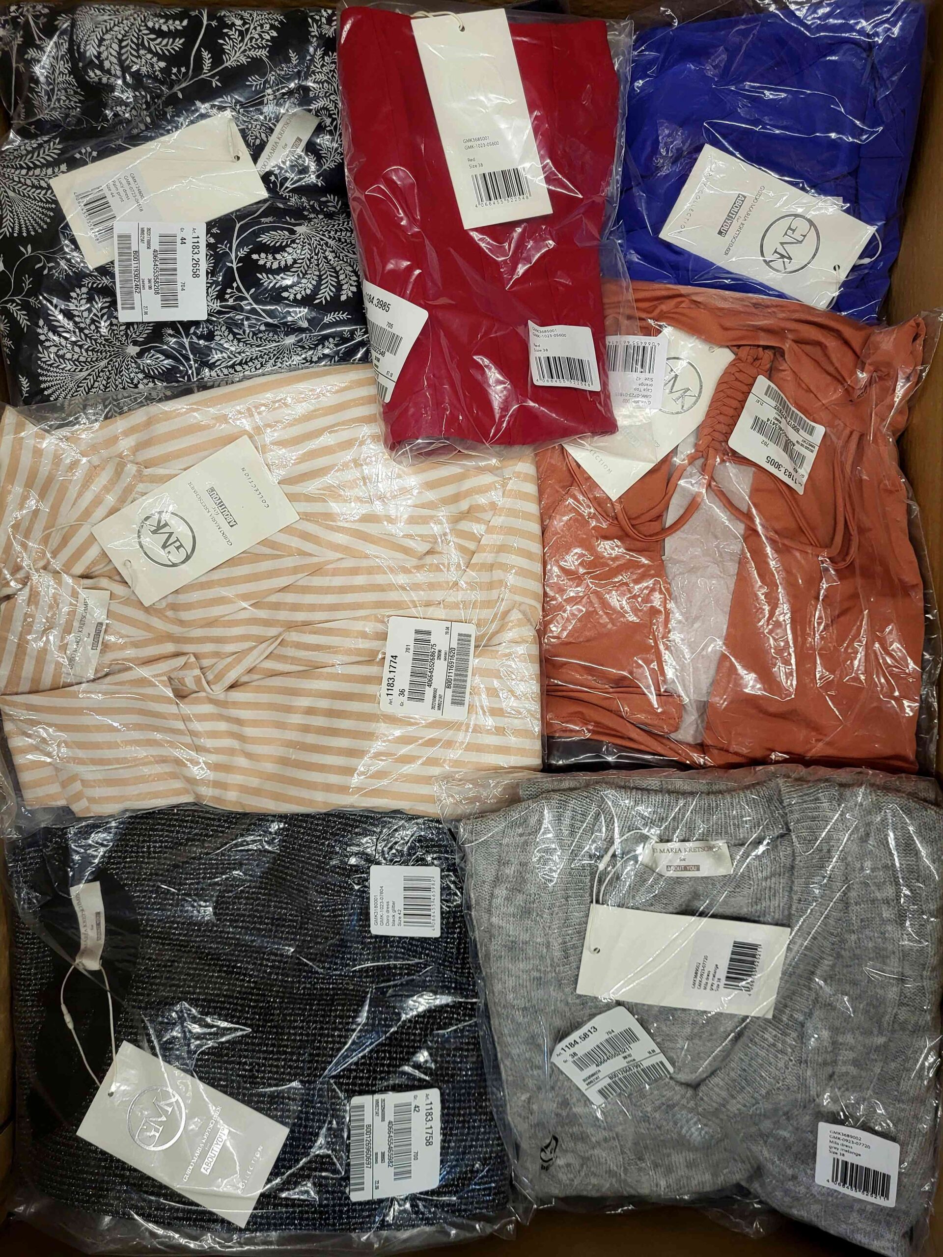 W skład pakietu wchodzi ok. 30 szt. odzieży damskiej m.in. kurtki, płaszcze, swetry, bluzy, spodnie, sukienki, bluzki, topy, paski, torebki, skarpety. W pakiecie może znaleźć się odzież męska.